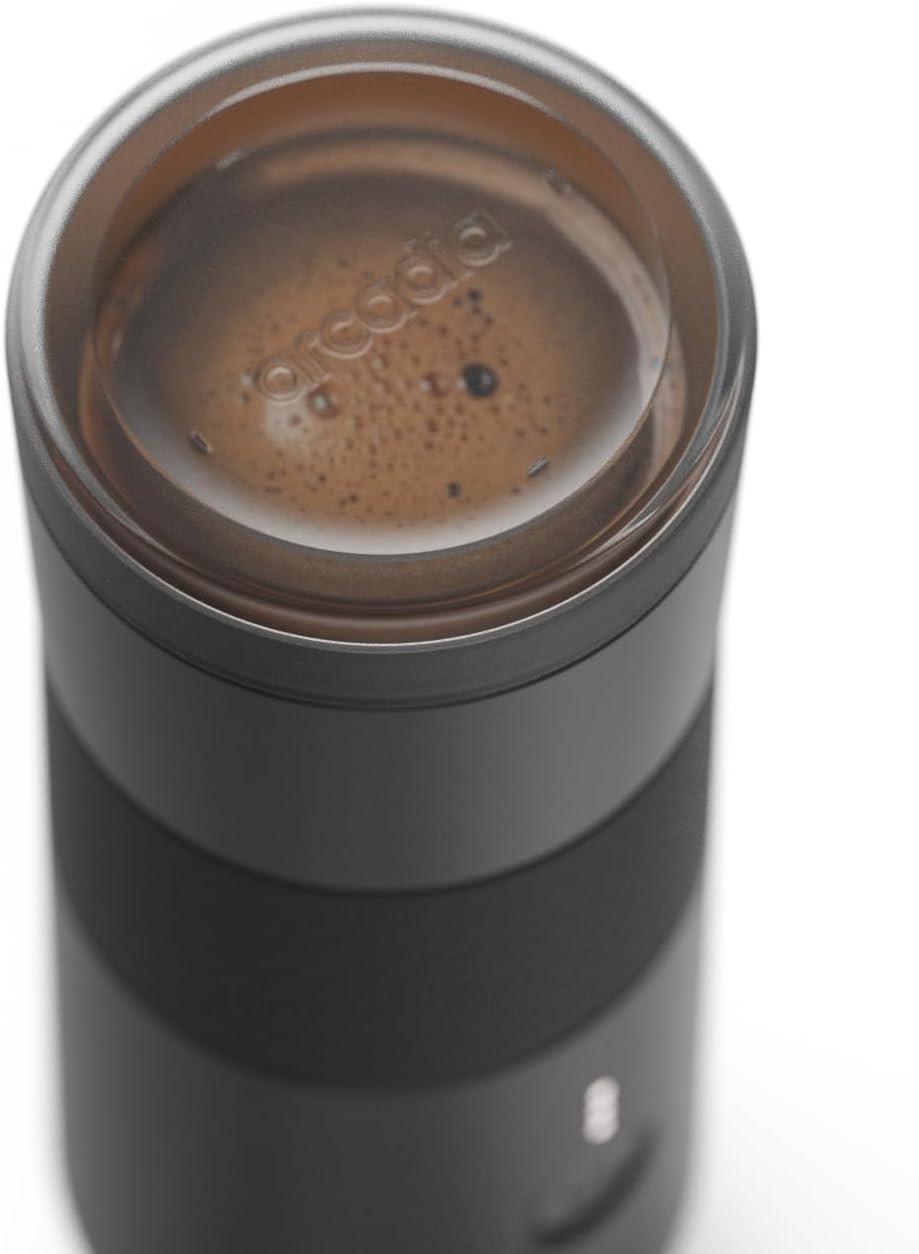 You lift it from its pouch and it settles in your palm with a compact, reassuring weight — present but not bulky. The night‑black shell feels cool and slightly grippy under your fingers; seams and the single button register as tidy, engineered details you notice without thinking.Branded Arcadia Go, it reads more like a narrow column than a squat pot, a visual balance that catches your eye as it sits on the counter. When you run it the low electronic hum and the soft click of the spoon docking become part of the room’s soundscape, and the base warms subtly, a small, honest cue that the device is doing what it was designed to do.