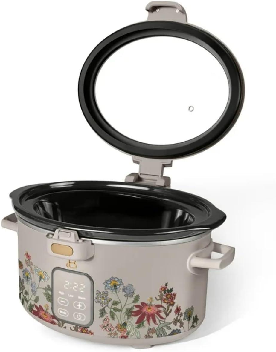 Lifting the Stunning by Drew Barrymore 4-Quart Programmable Slow Cooker from its box,you notice a clean,measured heft and the cool smoothness of the removable ceramic pot under your palm. The wildflower Porcini finish feels almost like softened stone when you brush it with your fingers, catching light without shouting for attention. Close the hinged lid and it gives a neat, confident click; a light tap on the touch display wakes a soft glow and a low, steady hum. It settles into the kitchen with a modest footprint and a composed presence, fingerprints and all, as you start your first cycle.