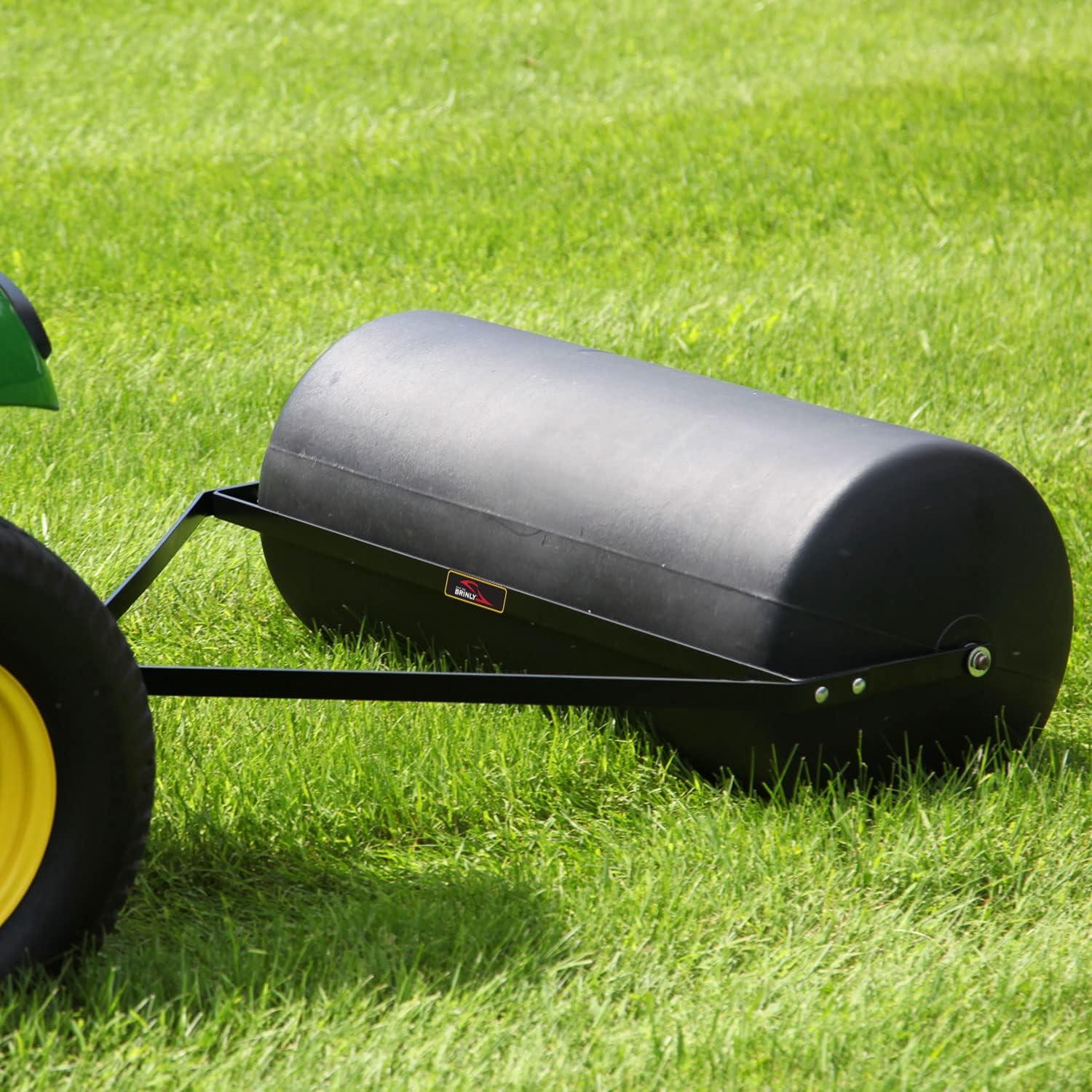 You feel the weight the first time you ease the⁤ Brinly ‍PRT-361BH-A 690 lb. Tow Behind Poly Lawn Roller with Easy Turn Plug,‌ 24 by 36-inch, Flat Black — call it the 36-inch brinly roller‍ — as​ it settles with a dull, grounded thud behind your mower. Its‍ poly drum is cool and slightly slick under your palms; the flat-black skin absorbs the afternoon light so the metal frame and hitch stand out in sharper, ‍utilitarian lines. Tugging ‌it into motion produces a slow, steady momentum and a muffled, rhythmic swish rather ​than any jangly noise, while⁣ the rounded drum ends⁣ register quietly against the turf. Visually it takes up a clear swath on the lawn and reads considerable in the garage, the sort of object that⁣ announces itself by presence before you even start rolling.