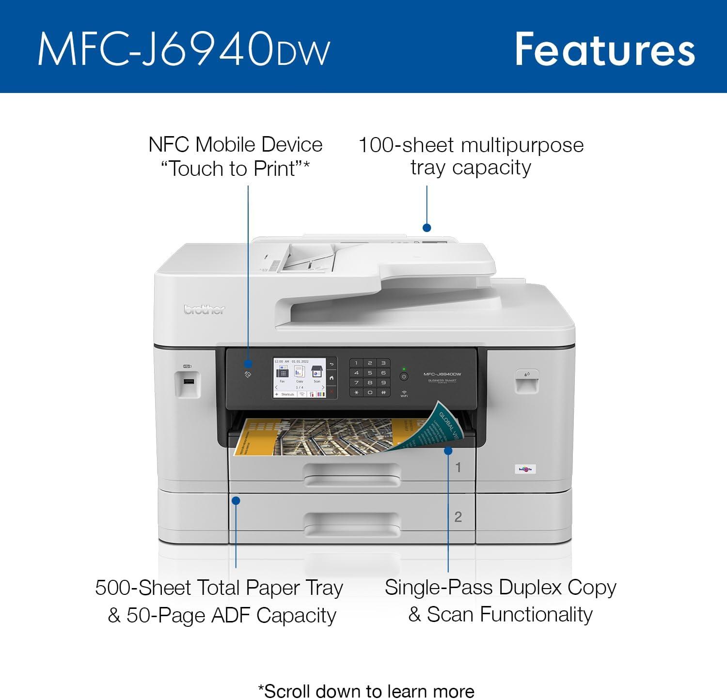 You slide it into the nook and its weight tells you this is not a lightweight impulse buy — it moves with a steady mass that feels intentional. The Brother MFC-J6940DW — the 6940 in everyday shorthand — wears a cool, matte plastic skin under your palms, and the paper trays close with a small, damped click that somehow feels reassuring. Powering up, a low mechanical hum and a soft blink from the 3.5″ display announce themselves; the first paper feed is accompanied by a precise, slightly brisk shuffle. Visually it reads as a wide, balanced block on the surface, and your fingers find the controls easily, noting the modest travel of buttons and the firmness of the touchscreen on first use.