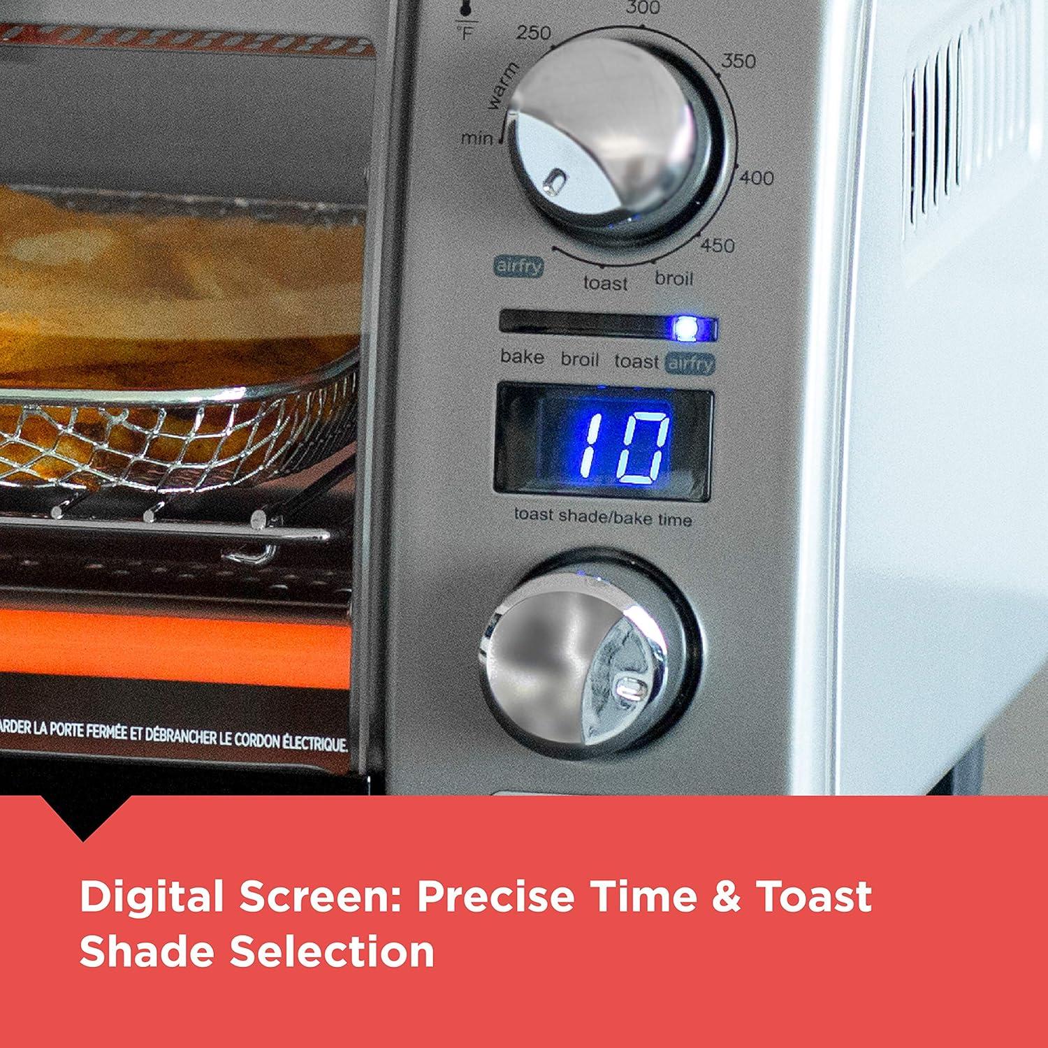 The digital controls add a layer of precision to every cook,allowing us to select from seven toast shade options and use the digital timer up to 60 minutes or the handy stay-on feature for longer recipes.Five versatile functions-Air Fry,Bake,broil,Toast,and Keep Warm-give us complete control over our cooking adventures,making it easier to multitask in the kitchen. The interior accommodates a 9-inch pizza or four slices of bread comfortably, making it ideal for small groups or family snacks.Plus, cleanup is effortless thanks to the slide-out crumb tray and included air fry mesh tray designed for easy maintenance.