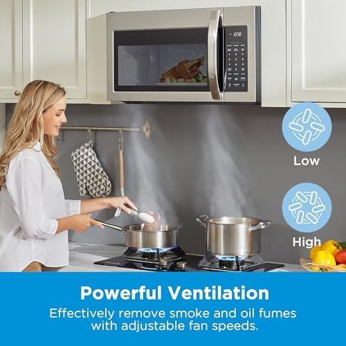 Its spacious 1.7 cu.ft. capacity with a 12.5-inch turntable can accommodate large dishes, such as a whole rotisserie chicken or a 12-inch pizza, making this appliance a practical addition to our kitchen. in addition, the microwave features 300 CFM ventilation power with adjustable fan speeds that effectively eliminate bad odors and smoke while cooking, keeping our kitchen fresh. With a bright cooktop light, we have clear visibility while preparing our meals, enhancing the overall cooking experience. Embrace the ease and efficiency of smart cooking—explore this essential kitchen tool further and see what delicious creations await us!