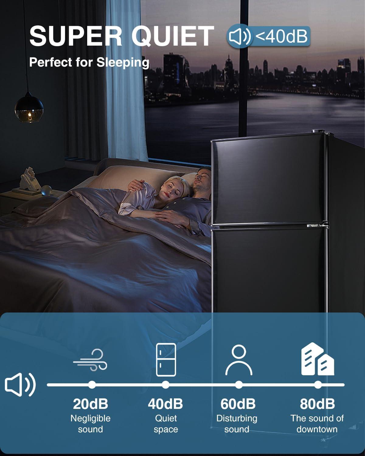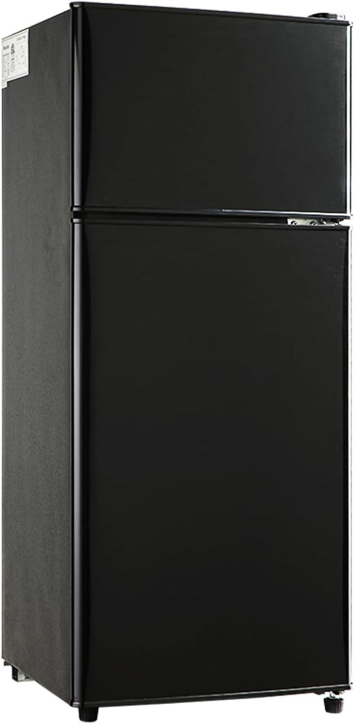 After a few weeks you stop announcing the double Door Mini Refrigerator with Freezer, 3.5 Cu.Ft Compact Fridge with Adjustable Shelve, Adjustable Thermostat for Bedroom, Dorm, Home, Office, Black and it simply occupies its corner, part of the room’s quieter pulse. in daily routines you reach for a cold drink without thinking, shift a shelf when leftovers stack up, and use the top as a temporary landing spot — small habits that map how it lives in the space. The black surface picks up fingerprints and a faint scuff where a box brushed past, little marks that accumulate as it’s used rather than dramatic change. Over time you notice it settles into routine.