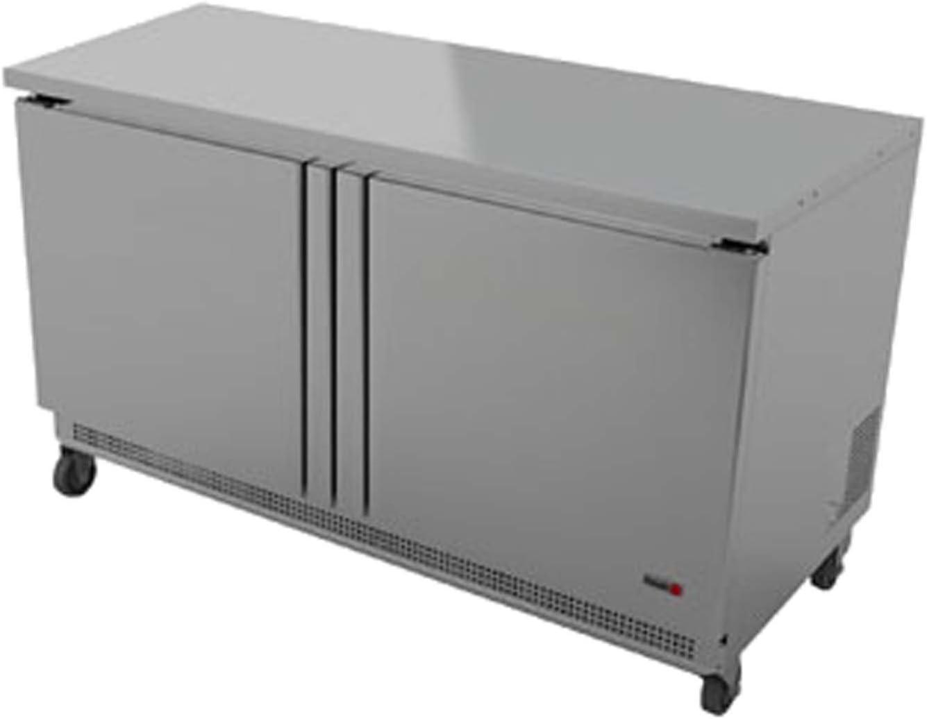 After putting this unit through rigorous use in a busy kitchen environment, we found it impressively reliable and efficient. the solid stainless steel construction not only offers durability but also gives it a sleek, professional appearance that fits well in any commercial setting.The two-section design with hinged solid doors allows for easy organization, while the four adjustable epoxy-coated wire shelves provide flexible storage options, accommodating a variety of frozen goods. Its bottom-mounted refrigeration system ensures consistent temperature control without taking up valuable overhead space, making it an ideal fit under counters.