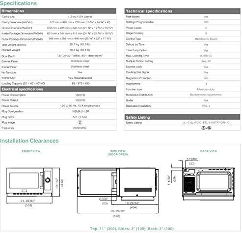 For those of us in the market for a reliable, medium-duty commercial microwave, this model stands out with its sleek design and robust performance. The 1.2 cubic feet capacity ensures it can accommodate larger dishes effortlessly, such as a 14-inch platter or a half-size pan. The 1000 Watts of cooking power, complemented by the bottom rotating antenna, guarantees even heating, which is essential in a busy kitchen. We appreciate the user-friendly touch control pads with braille navigation, making it accessible for everyone, including self-service environments. The multitude of settings—5 power levels and 3 cooking stages—provides us with versatility for various cooking demands, all while maintaining efficiency with a maximum cooking time of 60 minutes.