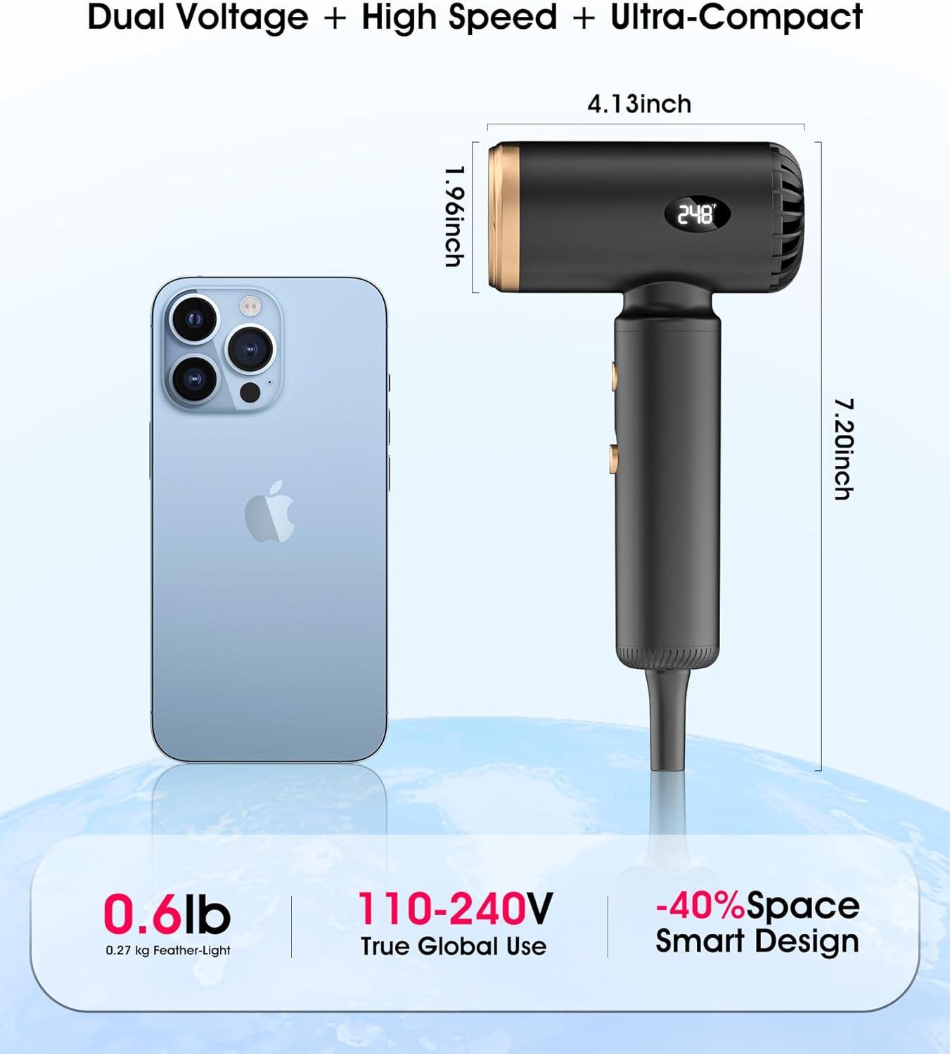 After a few weeks kept on the counter and folded into a toiletry bag, the Travel Hair Dryer, Dual Voltage Mini Ionic Blow Dryer has stopped announcing itself and instead slides into the small, repeated motions of getting ready. Its compact shape tucks neatly on crowded vanities, the magnetic diffuser clicks on and off without fuss, and the matte surface shows the faint scuffs of regular handling. In daily routines it is pulled from a drawer for quick touch-ups, set on a towel to cool, or slipped back into a bag, quiet and ordinary in regular household rhythms. It settles into routine.