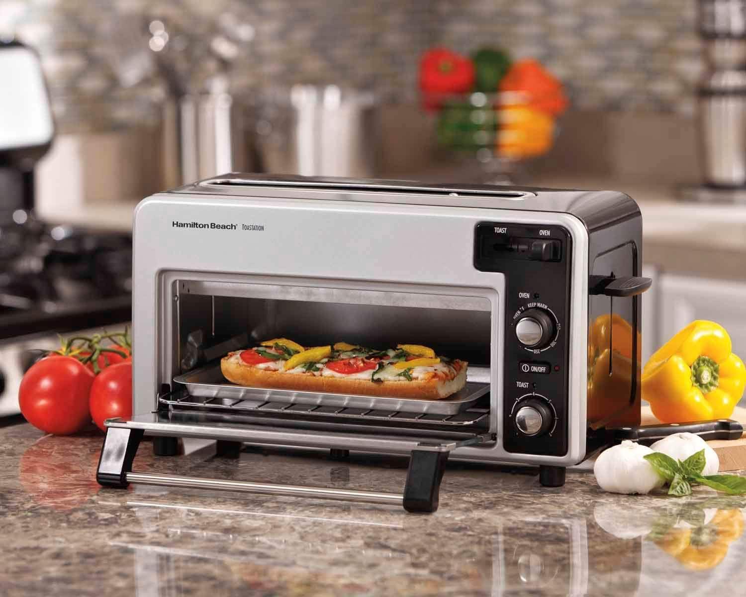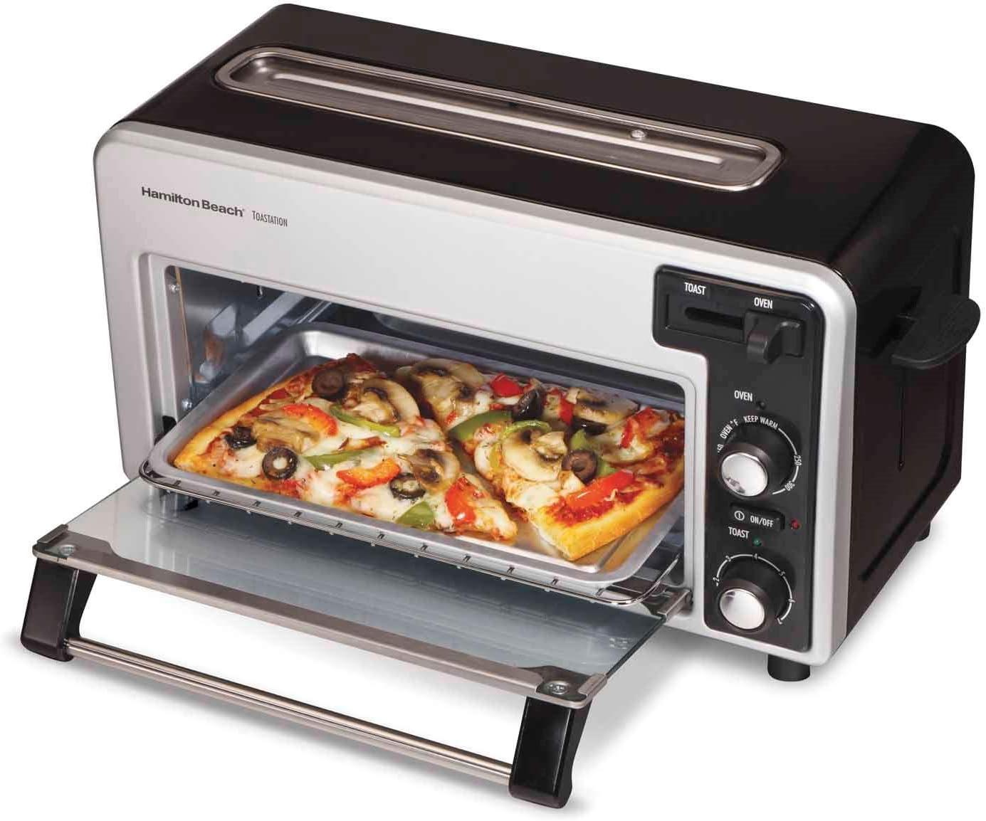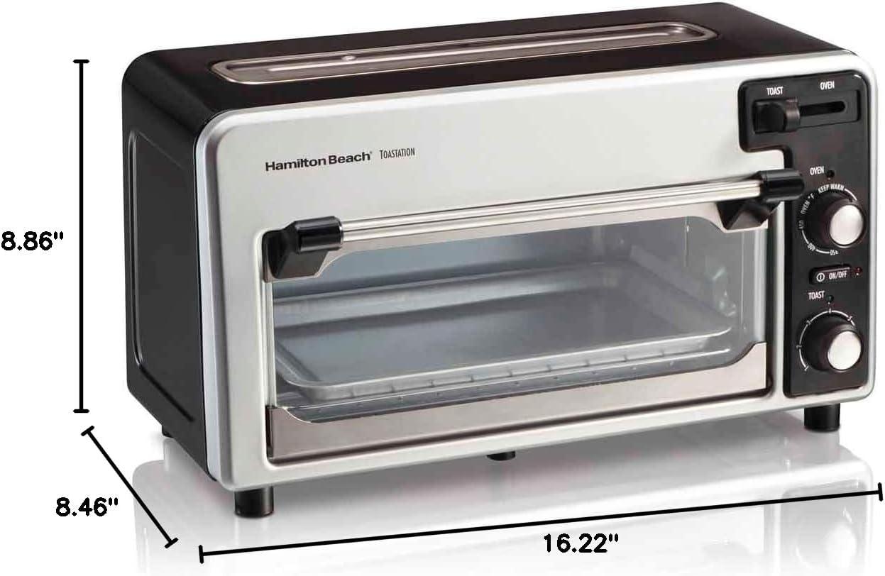 After living with the Hamilton Beach Toastation Oven with 2 Slice Toaster Combo, Ideal for Pizza, Chicken Nuggets, Fries and More, Black (22720), you notice how small habits form around it. in daily routines it takes its spot on the counter beside the coffee maker and a jar of utensils; over time you reach for its controls without thinking, wipe away crumbs more often, and watch the finish pick up the faint smudges of repeated use. It quietly shapes mornings and late-night snacks alike — sometimes nudged aside, sometimes front and center as meals are warmed and quick bites are finished. It settles into routine and stays.