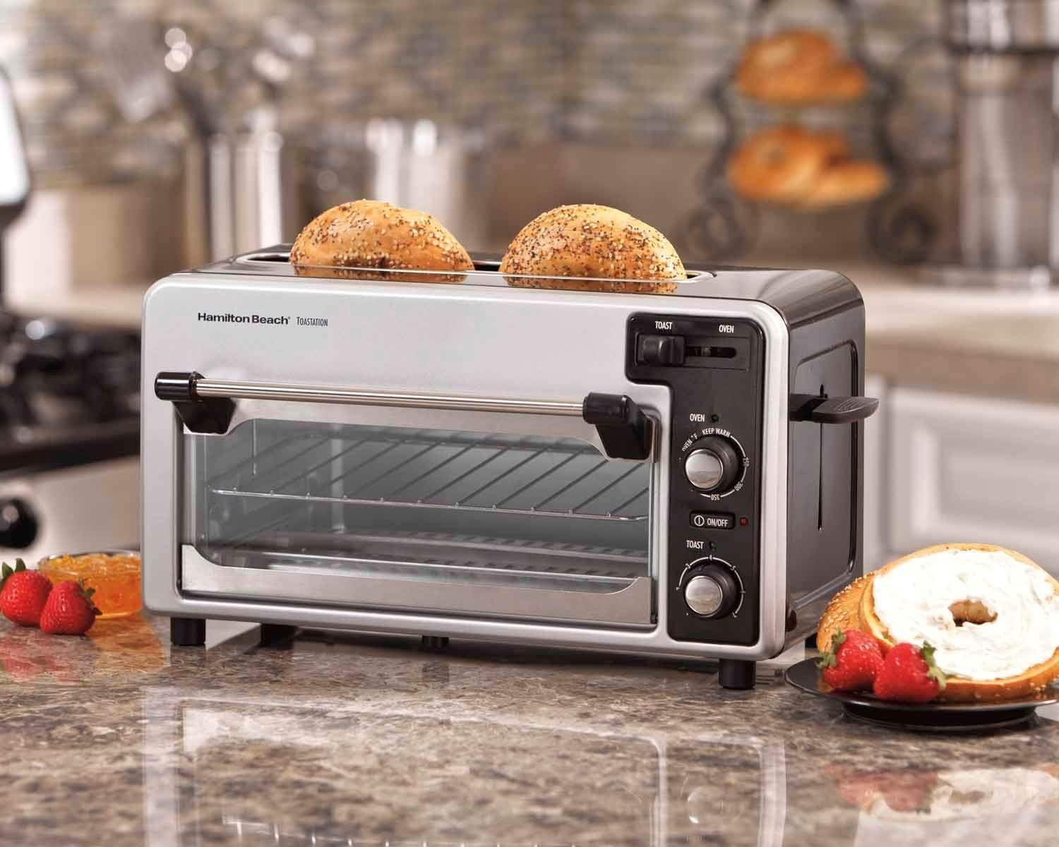 Your hand first notices the slightly textured plastic along the top and the cool, solid feel of the door edge. Hamilton Beach’s Toastation combo reads as a compact rectangle on the counter, wide enough to hint at extra capacity without looking bulky. Sliding the lever down gives a soft, confident click and a low, warming hum from inside, while the dial turns with a little mechanical resistance that feels familiar under your thumb.lift the rack and you sense modest weight and smooth metal under your fingers; the black finish shows a few fingerprints but the matte texture keeps them from shouting.