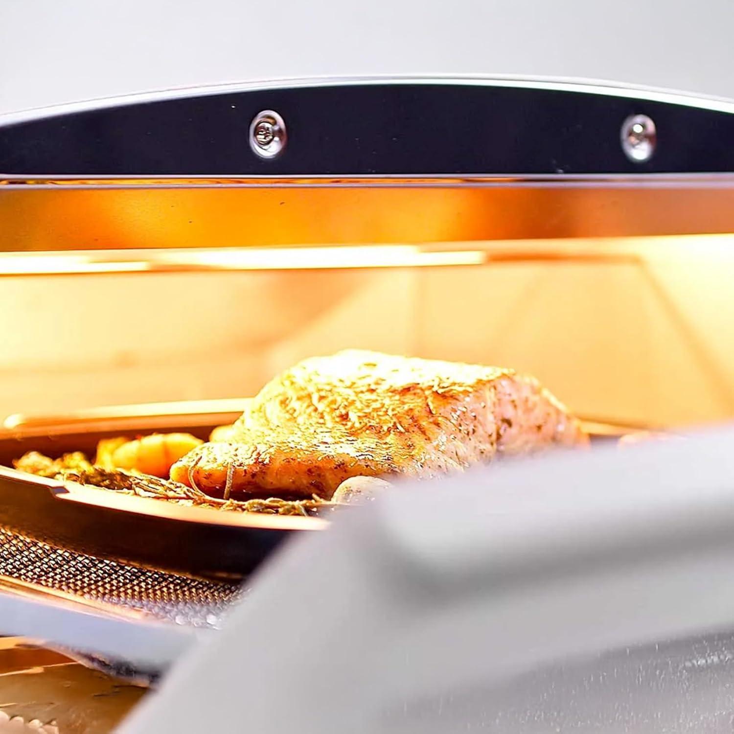 At rest on a countertop, it occupies a modest but discernible footprint: not as squat as a two-slice slot toaster and not as tall as a compact microwave, so it tends to read as a small oven when placed alongside other devices. Its proportions become more obvious in everyday use — opening the door, sliding pans in and out, or pulling the crumb tray — and those moments are what really define how much counter territory it claims. simple visual cues that affect that reading include: