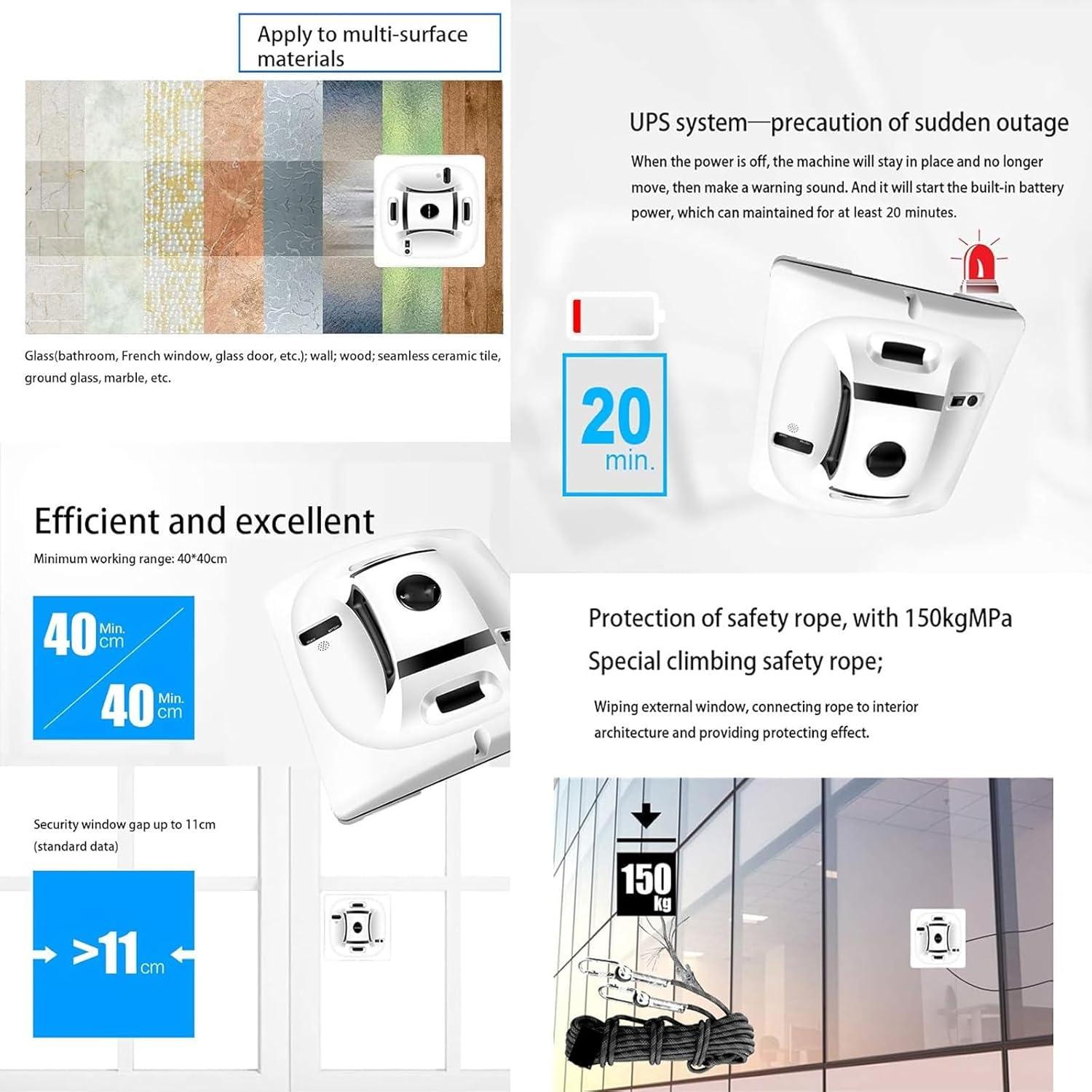 | Safety-frist design: high-strength rope supporting up to 150 kgf and anti-fall algorithm | 20-minute UPS backup is great but might be short for very large glass surfaces |