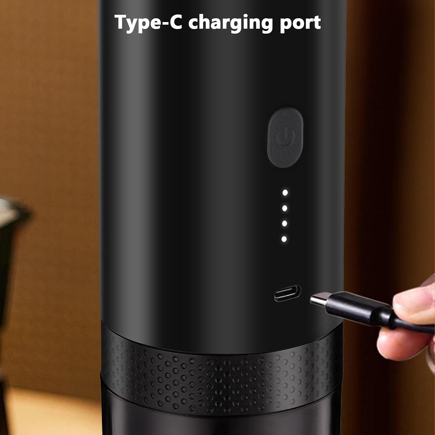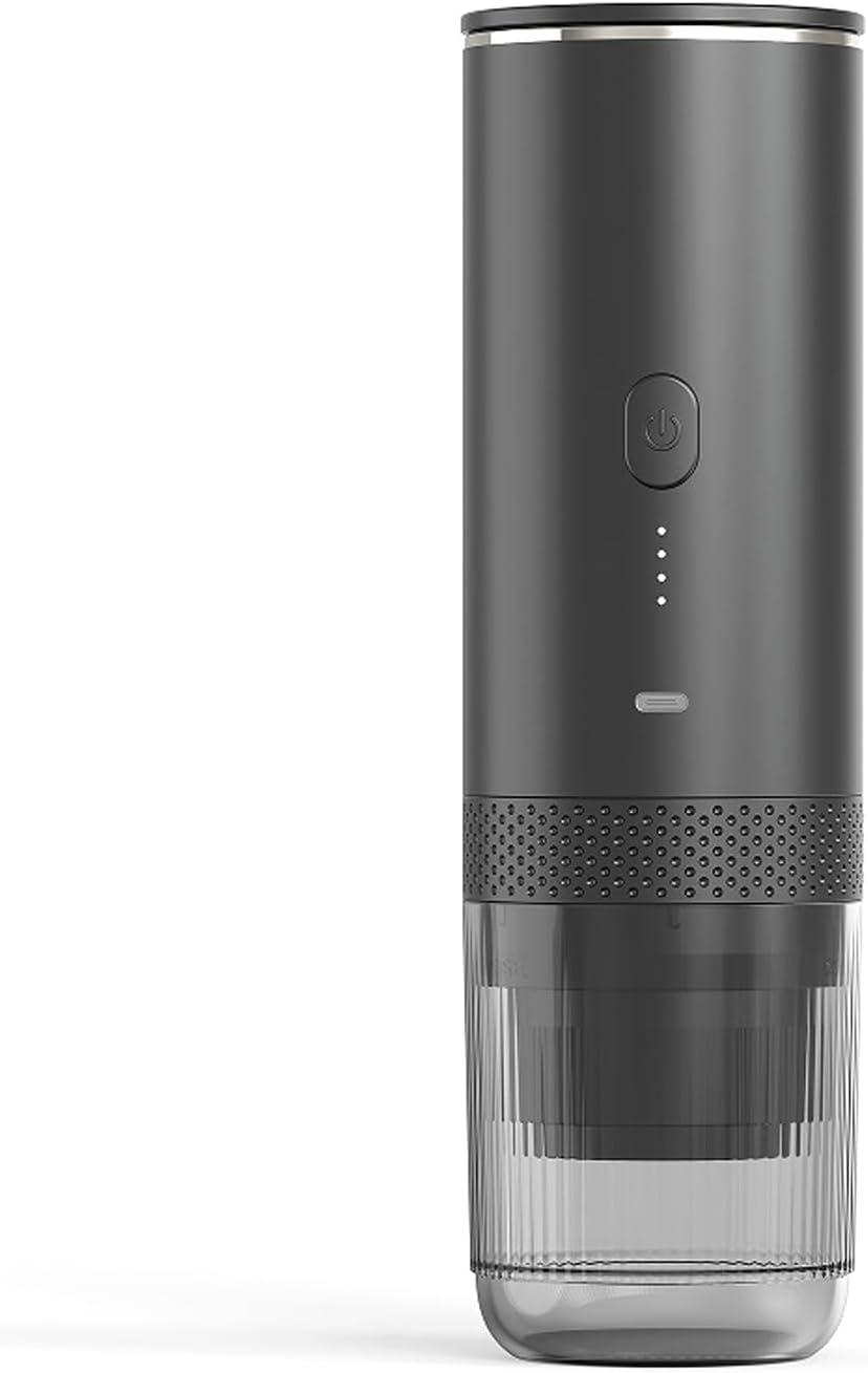 Lifting it from the box, you notice how the narrow, column-like silhouette slides easily into your palm and carries a compact but noticeable weight. The Irishom Portable Coffee Maker — a pared-down 2-in-1 grinder-and-capsule unit — wears a matte black skin that picks up fingerprints, a cool stainless rim, and a single low-profile button that sits flush until you press it. that press gives a soft click; a contained mechanical whir follows, with a faint vibration under your hand as internal parts spin and warm. The lid’s slight ribbing and the neat seams around ports register beneath your thumb, leaving the overall impression of a handheld machine built to be used as soon as you pick it up.