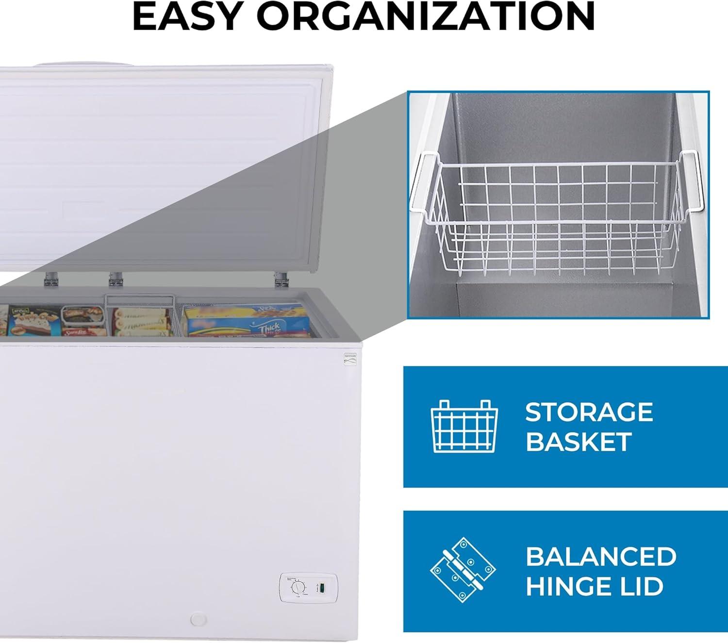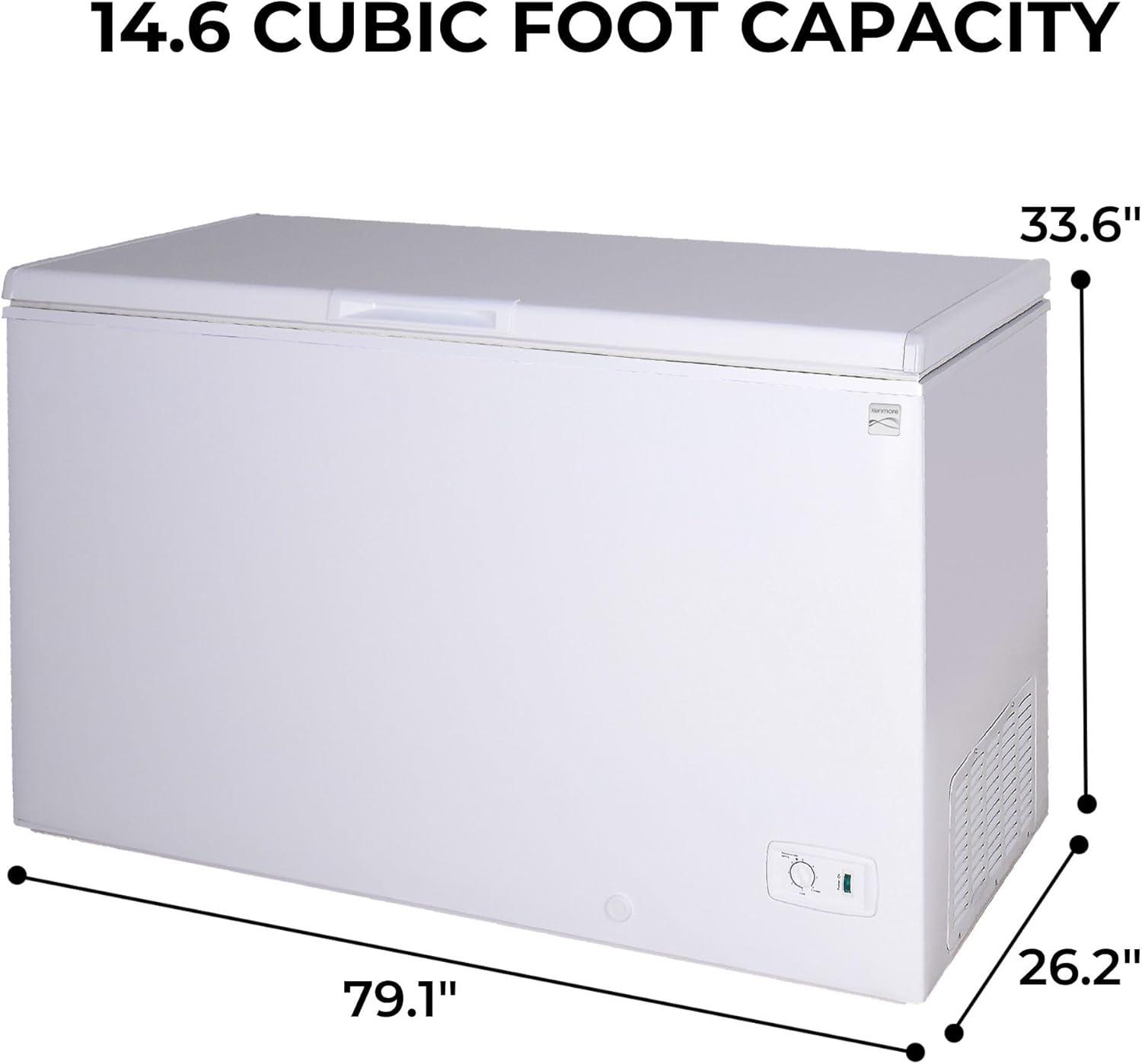 you give it a nudge across the floor and you immediately feel the weight settle with a satisfied thud—the kind that tells you it’s not going to wander. You notice the Kenmore Deep freezer – 14.6 Cu Ft as a squat, white chest that reads more like a piece of utility furniture than a flashy appliance. The lid meets your hand with a dense,cool resistance; the vinyl-coated rim has a faint texture under your fingers and the balanced hinge holds the lid where you leave it. Opened,a low compressor hum murmurs from the body while a small illuminated dial on the front quietly signals power. The removable basket slides out with a plasticky, dependable scrape and the low-profile drain cap sits unobtrusively at the front—visually, it simply occupies the space with plain, purposeful presence.