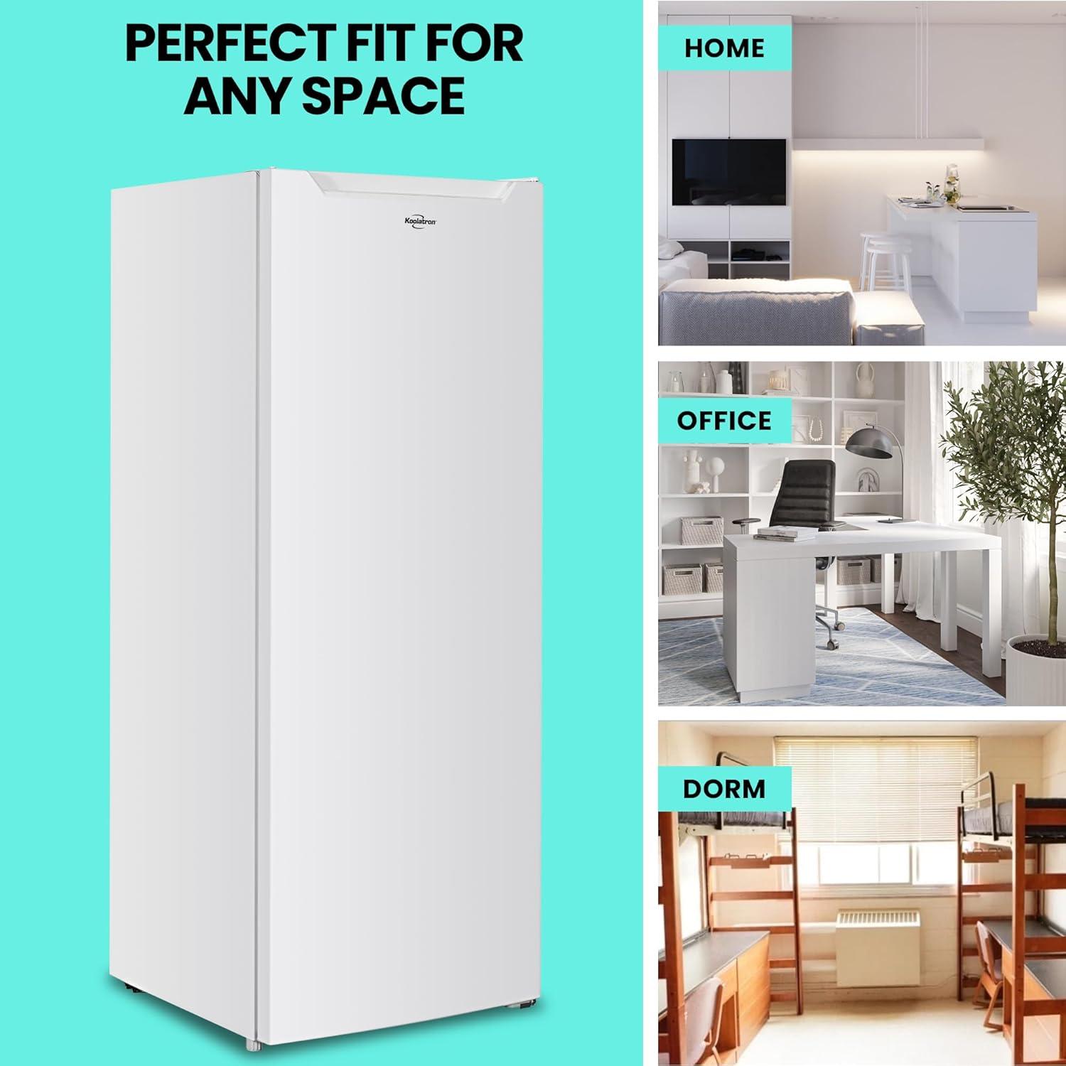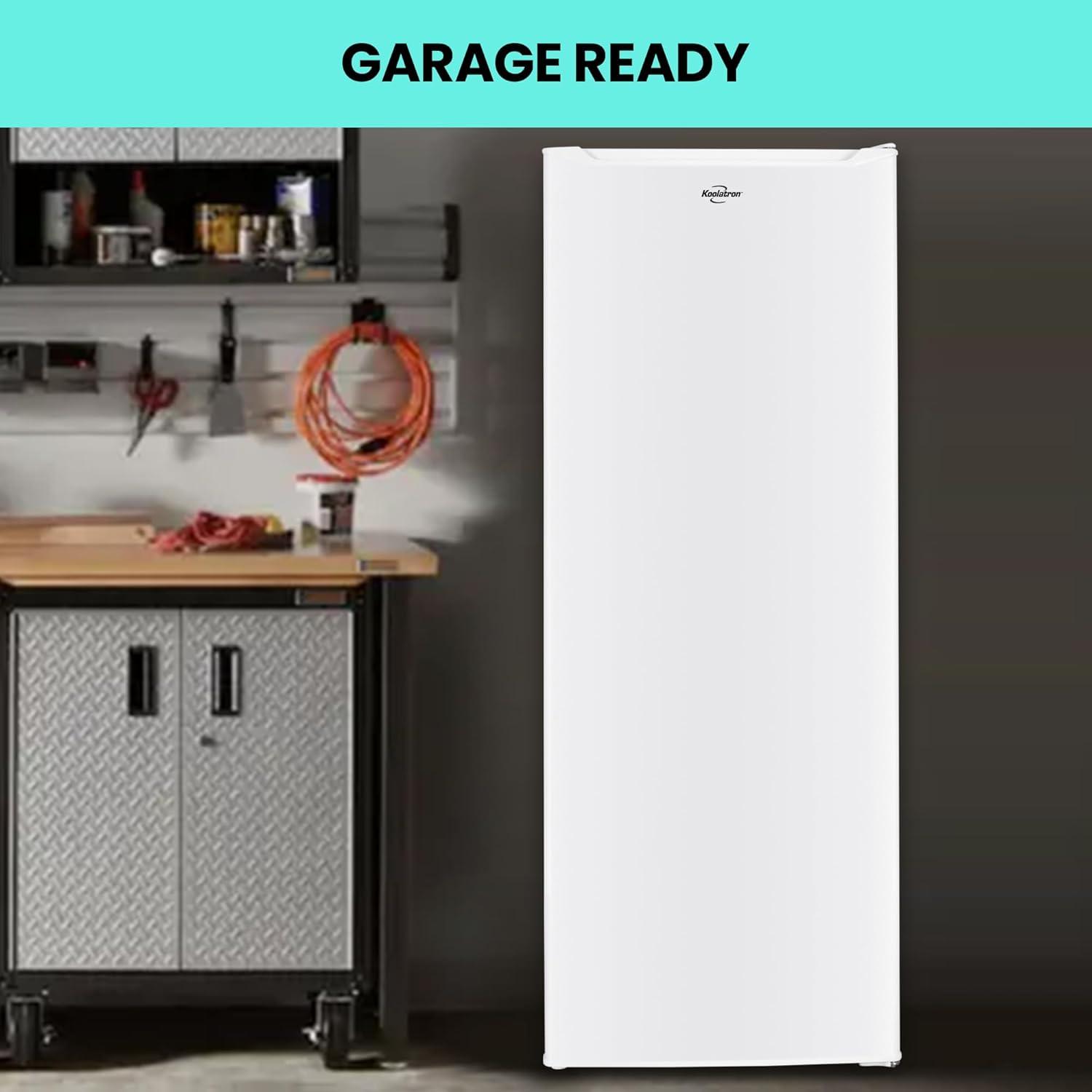 You pull the recessed handle and the Koolatron Upright Deep freezer eases open with a muted, steady whoosh, the door’s motion more measured than you expected.The white finish is matte and cool under your palm; the seam where door meets cabinet feels smooth, and the flat back makes it tuck into the corner without looking bulky. Slide a bag across a wire shelf and there’s a thin metallic clink, the interior catching the light in a compact, efficient way. When you nudge the unit to check its weight it shifts with a reassuring heft, and the low compressor hum soon becomes just another steady rhythm in the room.