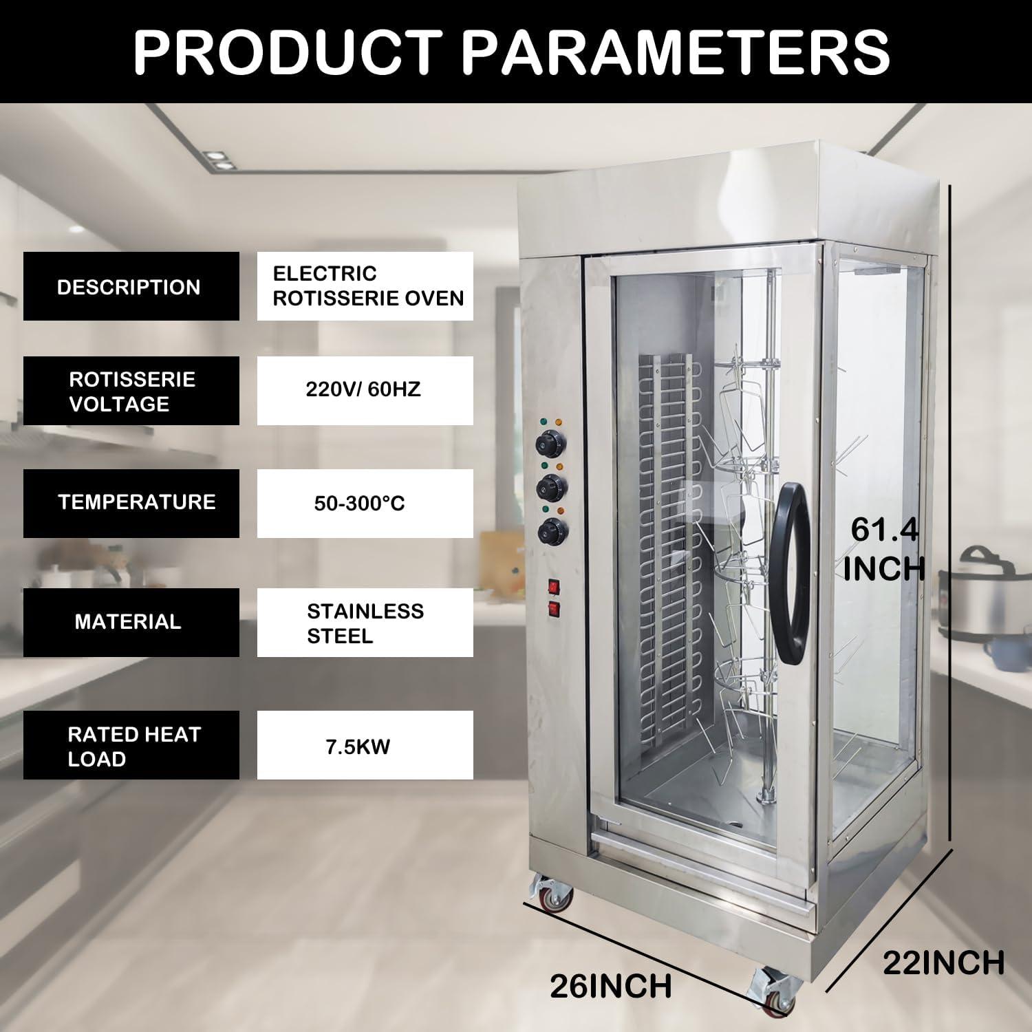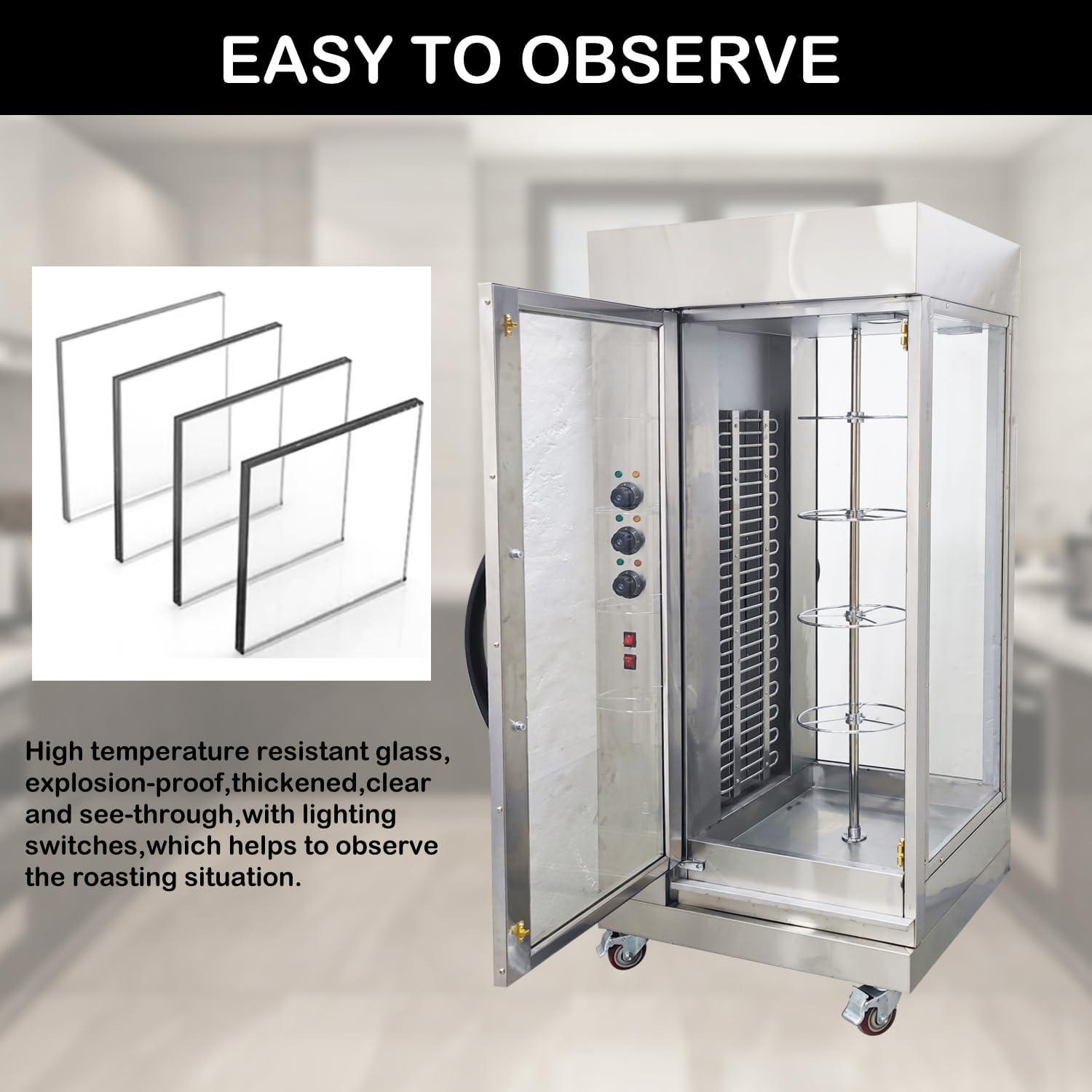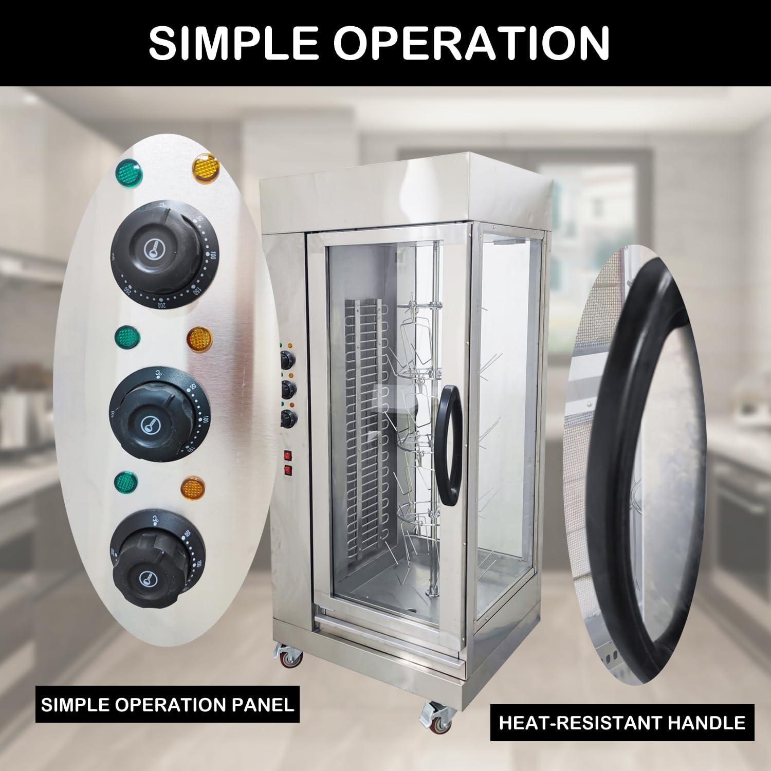 Operating this rotisserie has proven to be remarkably straightforward. The intuitive temperature adjustment, ranging from 50 to 300°C, allows us to customize the heat precisely for different types of poultry without guesswork.Watching the cooking progress is effortless thanks to the double-layered high-temperature glass panels, which also help retain heat efficiently. The built-in illumination switch is a subtle yet valuable feature, enabling clear visibility even in dim kitchen settings. Maneuvering the unit is a breeze thanks to the bottom-mounted swivel casters, which give us the flexibility to relocate it as needed without any strain.