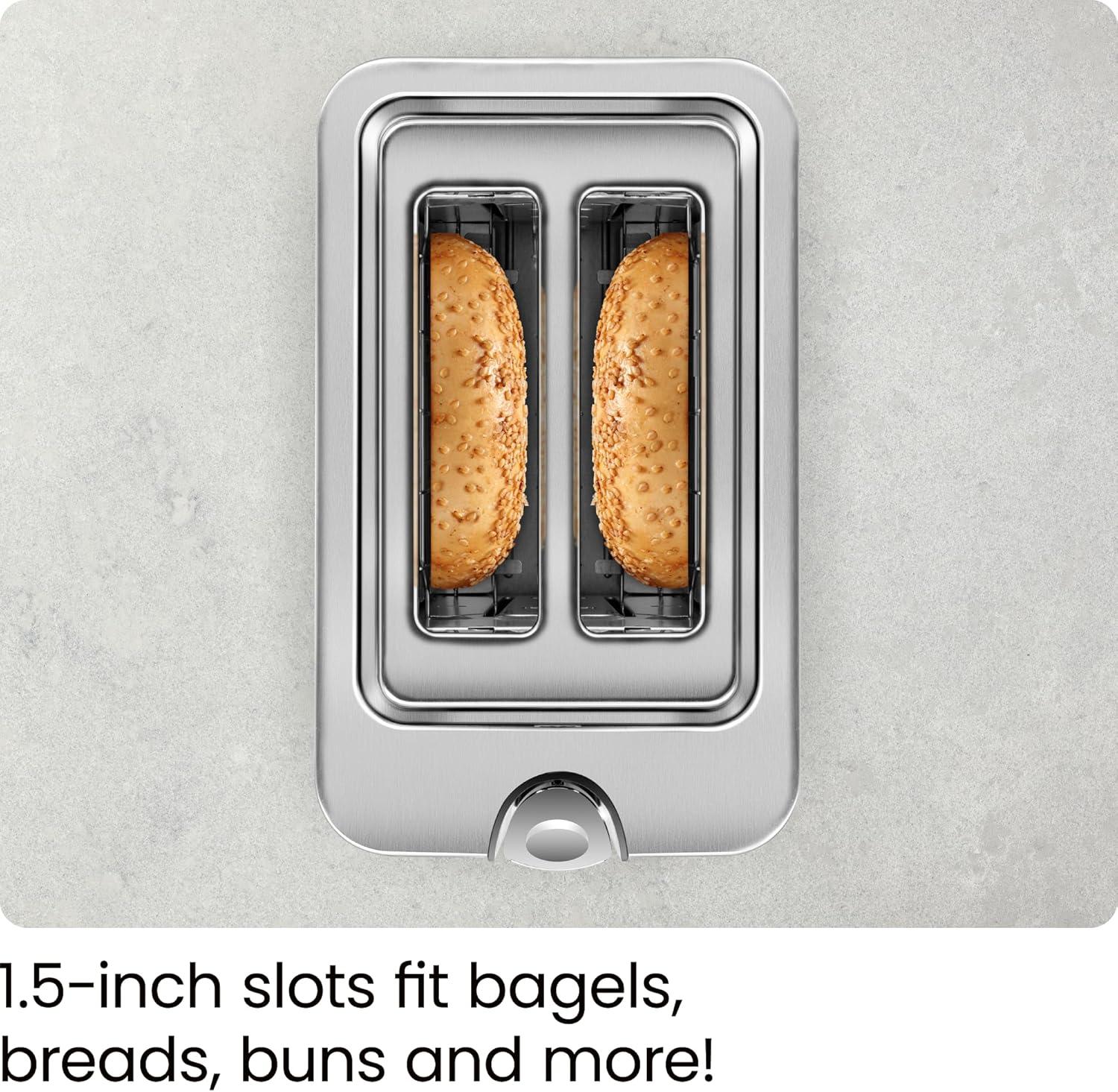 | Extra-Wide Slots: Easily fits bagels, thick breads, and artisan slices without a struggle. | Compact Capacity: Only two slices at a time, which might slow down larger households. |