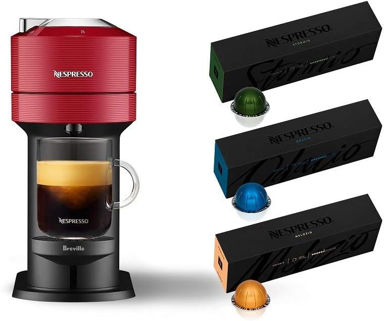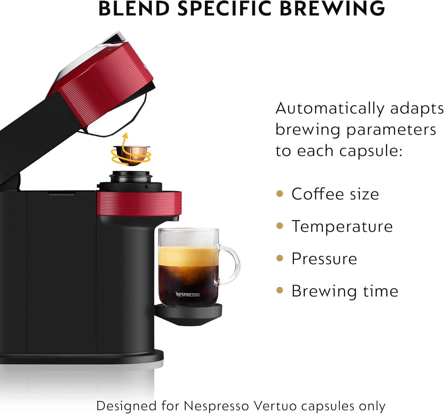 Your fingers find the cool, slightly textured shell before you lift it—finished in cherry, it reads narrower then you expected. The Nespresso Vertuo Next by breville has an unexpectedly light heft, yet the plastics and metal trim feel planted and well-joined under your palm. Close the head and the lever clicks into place; as the capsule spins you hear a low, controlled whir and the first steam-scented breath of coffee rises, quick and clean. Visually it balances rounded curves with tidy seams, the kind of presence that settles into a kitchen without demanding attention.