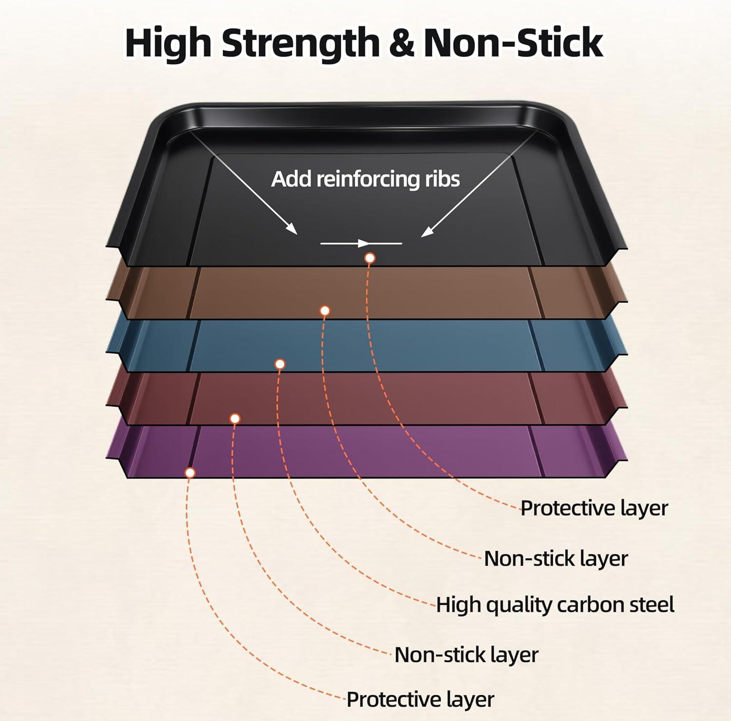 When you lift the tray, the first thing you notice is its feel in the hands: it has a modest heft that reads as stable rather than light or flimsy, and the rolled rim gives you something secure to grasp. the edges are not sharp, so your fingers settle naturally when you shift it in and out of place; simultaneously occurring the body keeps a slight, predictable stiffness when you try a gentle bend with both hands, so it doesn’t flop. Small, everyday interactions — nudging it to center on a rack, sliding a spatula along the corner, catching a stray drip with the rim — all register as familiar kitchen motions rather than delicate maneuvers.