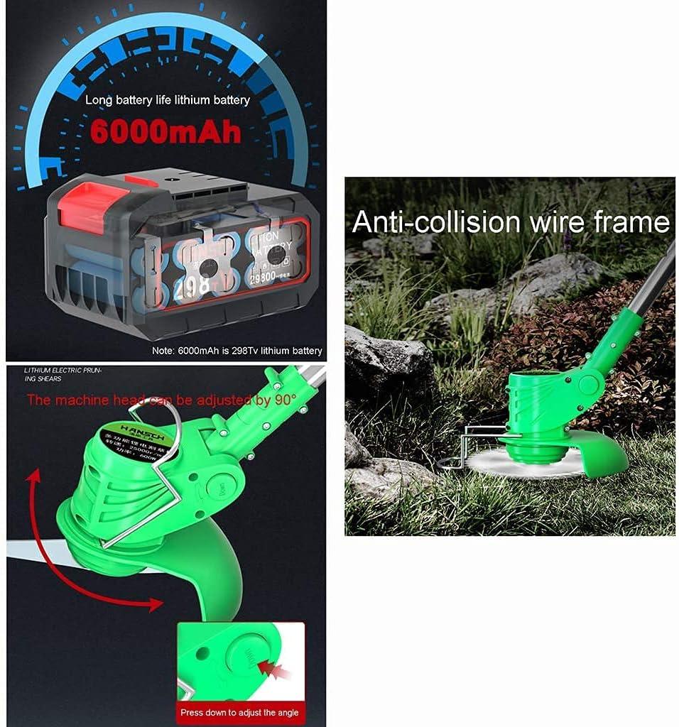 Our experience with this cordless lawn mower highlights its standout blend of portability,efficiency,and user-friendliness. Weighing just 1.2 kg, its lightweight and ergonomic design, paired with a soft rubber grip, ensures comfortable handling even during extended use. The 90° adjustable head provides excellent versatility, allowing us to trim hard-to-reach corners and edges with ease. Thanks to the powerful nylon blade system operating at 6000 rpm,cuts are consistently sharp and precise,making lawn maintenance quicker and hassle-free. The noise reduction features also make this tool ideal for noise-sensitive environments, delivering almost silent operation without compromising on power.