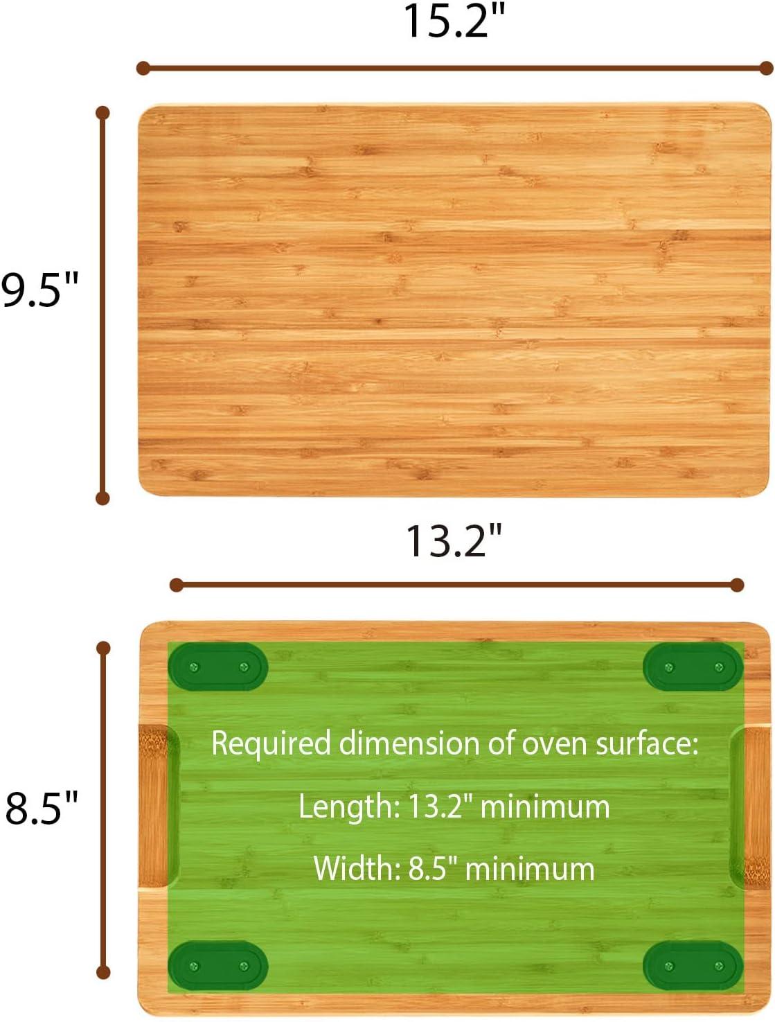 Crafted from durable bamboo, this cutting board perfectly complements our Mini Smart Toaster Oven. Its clean, unembellished surface adds a touch of natural elegance to our countertop without overwhelming the kitchen’s aesthetic. The board’s precise dimensions and well-thought-out design ensure a seamless fit atop the oven, effectively elevating the space. Four heat-resistant, non-skid silicone feet raise the board about 0.4 inches above the oven’s surface, creating a vital airflow channel. This thoughtful feature not only prevents heat damage to both the board and appliance but also stops unwanted sliding, giving us peace of mind when placing hot trays or accessories on it.