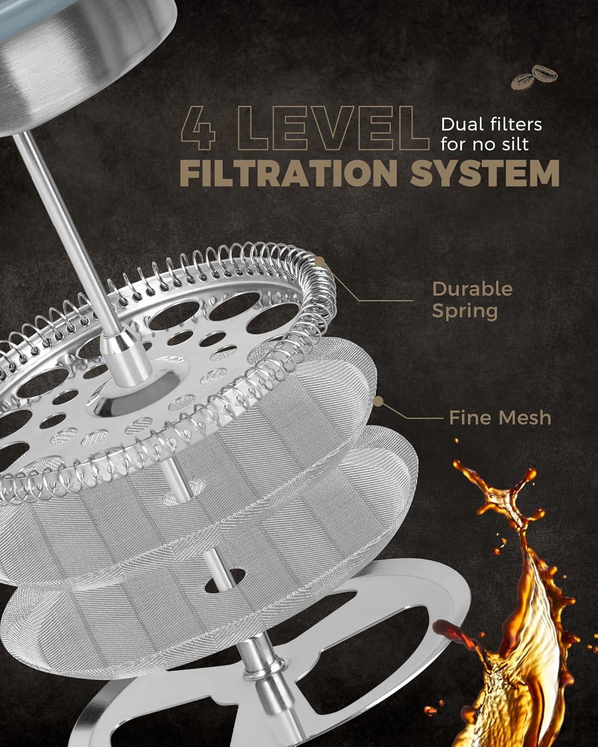 In everyday use the press tends to behave like a familiar manual brewer: grounds bloom,a steady plunge yields a clean pour,and steaming mugs stay warmer than they did with a glass carafe. the double-wall construction is noticeable when it comes to temperature — the body doesn’t feel as hot to the touch and brewed coffee holds heat for a longer stretch than some earlier stainless and glass presses used at the same time. The dual-mesh assembly shows up in routine use as well; most brews come through with minimal sediment and the plunger travels smoothly, though the top-to-bottom feel of the mechanism can vary a little from unit to unit.