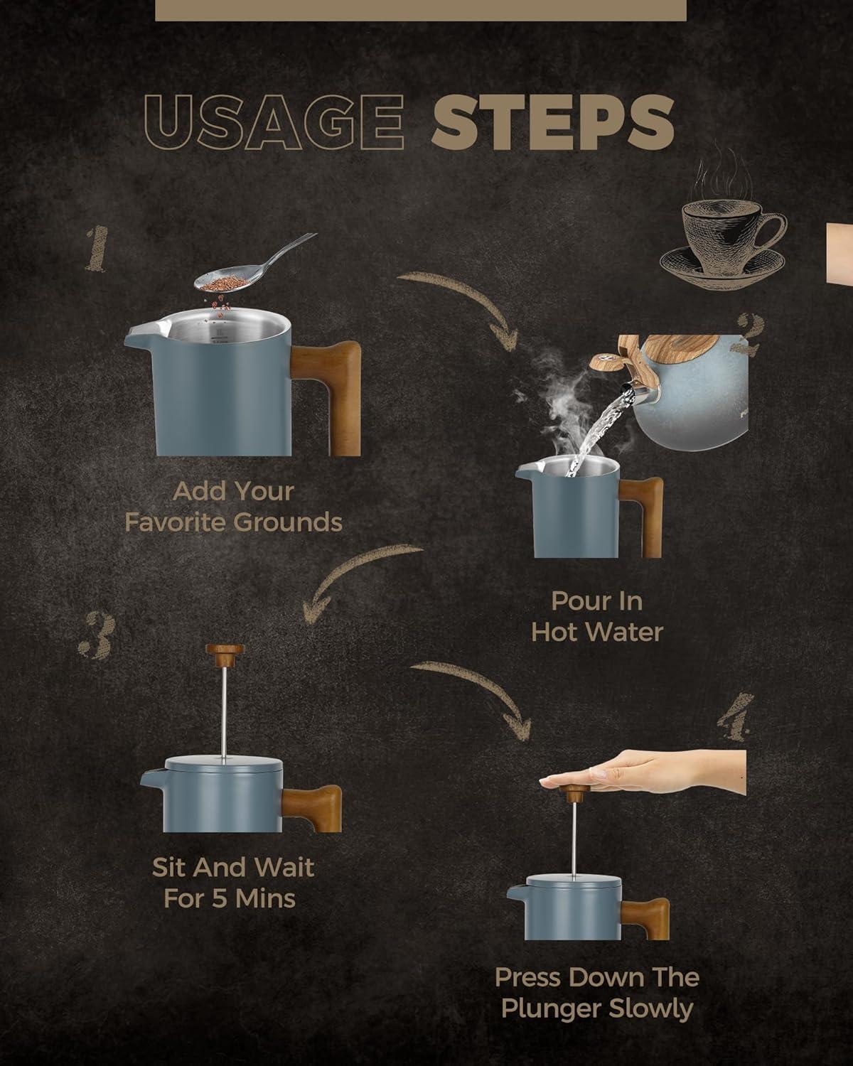 When you notice it on the counter that morning, the first thing that hits you is its presence — not flashy, but promptly distinct among your mugs and the kettle. The stainless body has a muted sheen that catches the low light through the window, and the wooden handle adds a warm, organic contrast to the metal. Placed beside a stack of cups, it reads as a purposeful object: compact enough not to dominate the surface, yet solid enough that you can tell it won’t wobble if you nudge it.A faint ring of water where it was set down after rinsing or the soft, hollow clink when you tap the lid are small, everyday signals that it’s been used and is part of the morning rhythm.
