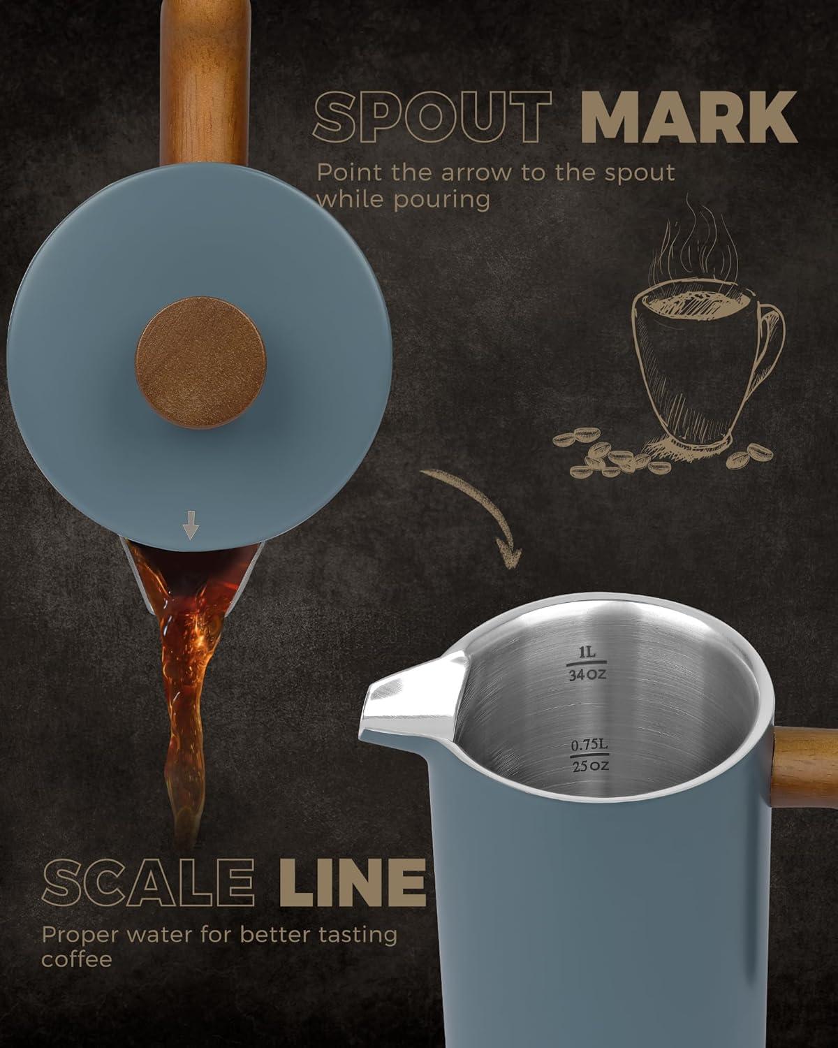 Over time, the POLIVIAR French Press Coffee Maker, 34 oz Coffee Press with Real Wood handle, Double Wall Insulation & Dual-Filter Screen, Food Grade Stainless Steel for Good Coffee and Tea (Alpline) finds a small, habitual place on the counter, nudged by mugs and the jar of spoons as mornings move through. in daily rhythms the wooden handle gathers faint fingerprints, the steel shows tiny scuffs where it’s used, and the motions of filling, plunging and rinsing fold into the kitchen’s regular movements. It slides toward the sink when dishes pile up and is set back down when the surface is cleared, present without fuss. It settles into routine.