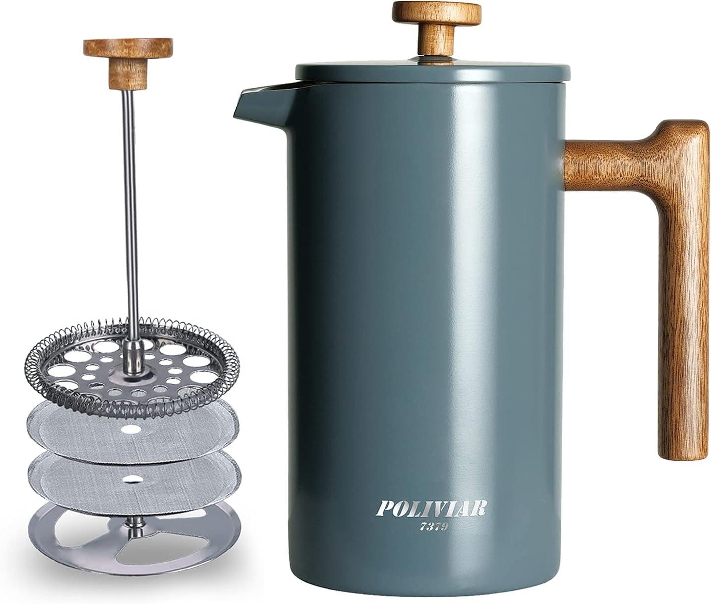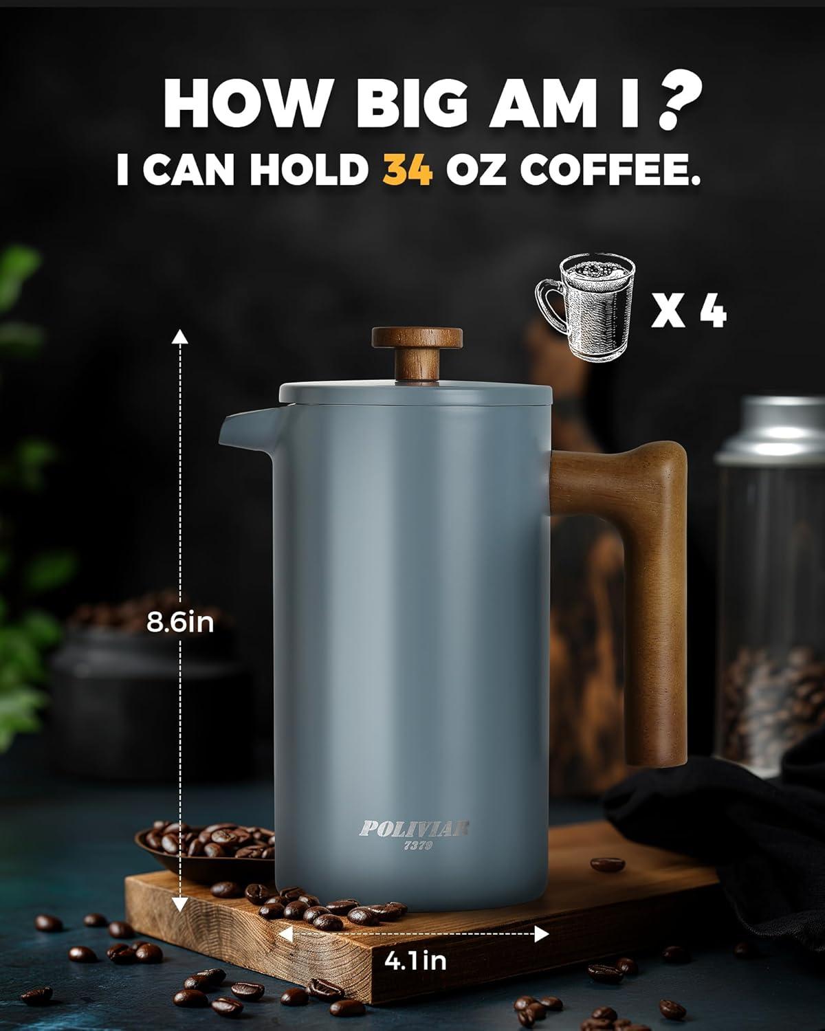 You lift the POLIVIAR French Press Coffee Maker—the 34 oz Alpine model—adn its weight settles into your hand with a different gravity than the glass presses you’ve used. Cool brushed stainless meets a warm, slightly grainy real-wood handle under your palm, and the piece tips and balances in a way that feels quietly intentional. The plunger slips with a soft whoosh through the dual-filter stack, and the body gives a muted, solid thunk when you set it down instead of a fragile ring. In that first minute it registers as an object with texture, sound and presence rather than just another appliance.