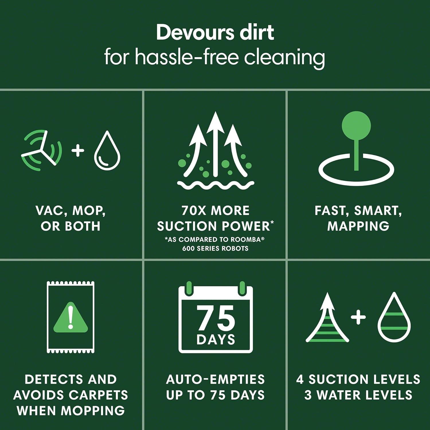 - hands-free maintenance: The AutoEmpty Dock holds up to 75 days of dirt, significantly cutting down on upkeep.