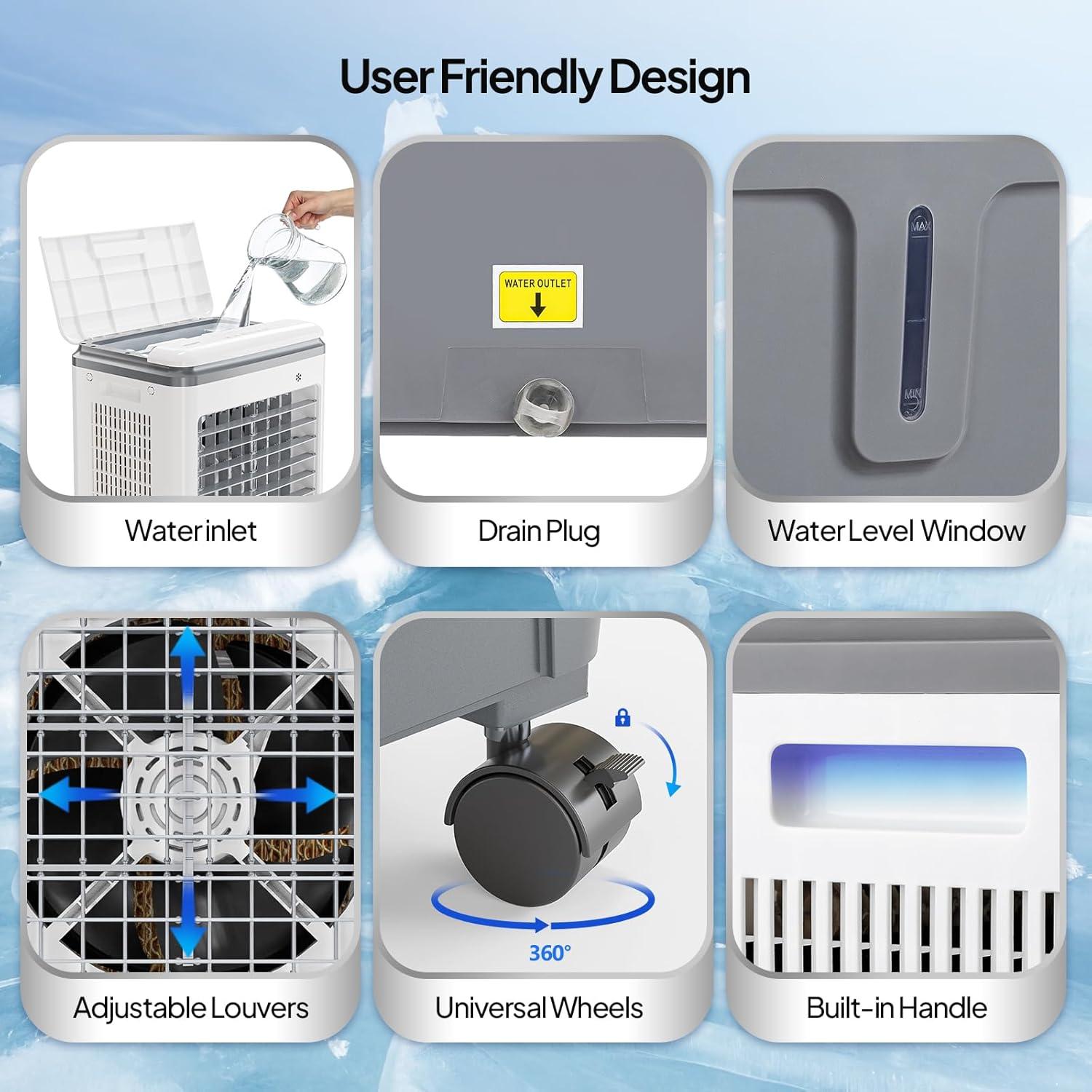 During ordinary use, users tend to notice a quick sense of airflow and a subtle drop in perceived temperature when the unit is positioned nearby and fitted with frozen ice packs; the remote and top-panel controls make switching modes and setting the timer an everyday, frequently enough one-handed interaction. The unit’s horizontal and vertical oscillation shows its value in spreading that airflow across a seating area rather than focusing it in a single spot, and the caster wheels make short, occasional relocations—from porch to kitchen, for example—feel effortless even with some water inside.Routine interactions are visible: refilling the tank every so many hours, fetching ice packs from the freezer before hot afternoons, and nudging the chassis a little if the aiming needs adjustment; in quieter rooms the motor and fan noise becomes a regular ambient element, while in busier spaces it tends to blend into background sounds.