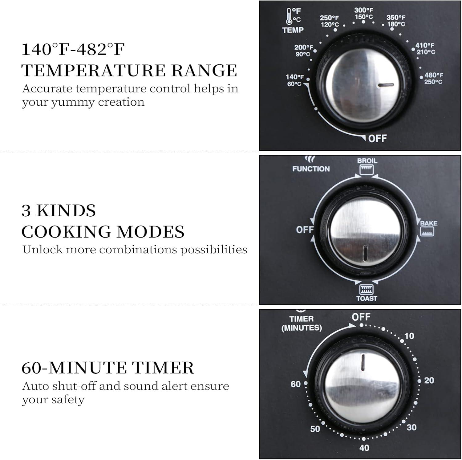 When you reach for the front panel first thing,the tactile click of each control becomes part of the routine.The mode knob slides through familiar stops — Bake, Broil, Toast — and you can feel where each position sits without looking. The timer is a simple, wind-style dial; you turn it until the marker lines up with the minute notch and the little ratchet inside begins its quiet countdown. While somthing bakes you tend to watch the door more than the numbers, catching the slow lift of steam on the glass and the way crusts darken through the window. For quick toasts or reheats you give the timer a short twist and go about other tasks, returning when the mechanical tick has nearly run out or when the oven’s familiar “ding” calls you back. Occasionally you nudge a knob mid-cycle to shift from broil to a lower heat, a small, unplanned adjustment that feels natural in the flow of cooking.