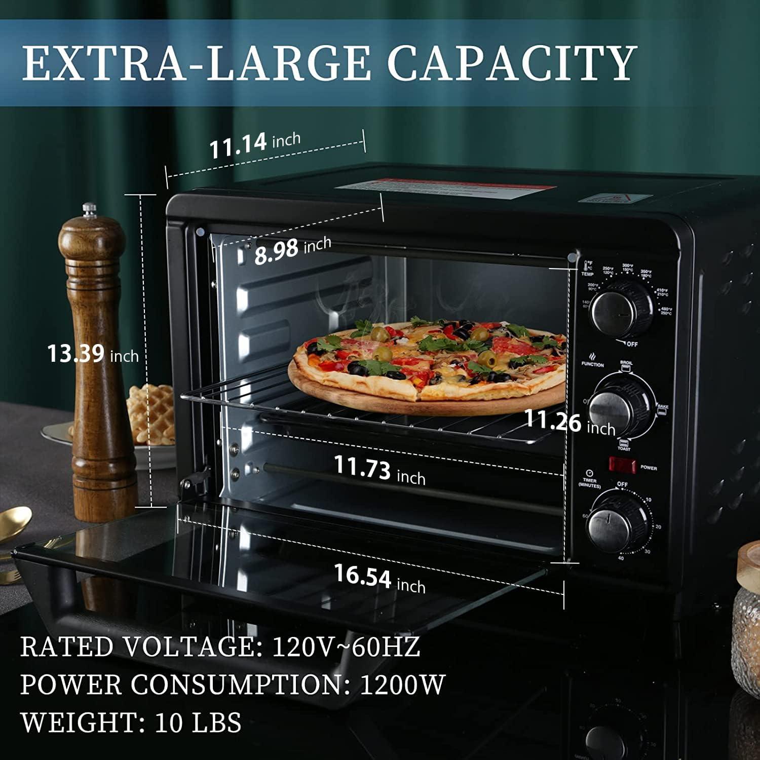 On a typical counter it finds a home where an outlet is handy and space is a little snug — often beside the coffee maker or tucked under an overhang so it doesn’t compete visually with larger appliances. The interior routinely swallows everyday items without fuss: a pair of slices of bread, a small baking sheet, a personal-sized pizza or a modest tray of vegetables. Below is a compact reference of common items and how they sit inside the cavity for quick visual orientation.