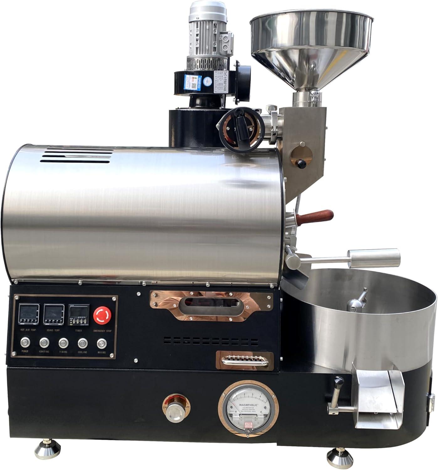 You slide the roaster into place and instantly notice the weight—it’s a grounded presence, not something that breathes light into the room. The 304 stainless shell feels cool and faintly textured under your palm, seams and welds showing where function was given form. A low mechanical thrum from the four motors settles in as you reach for the sampler spoon; the sight glass catches the overhead light and makes the drum seem busier than its boxy silhouette suggests.Your first tap on the control panel registers with a tidy, tactile click, and a small metal plate by the controls quietly names the unit as GastroRoast 1K. In the moments you’re getting familiar, the machine reads as practical and purposeful—its footprint, finishes, and subtle noises all speak before any roast does.