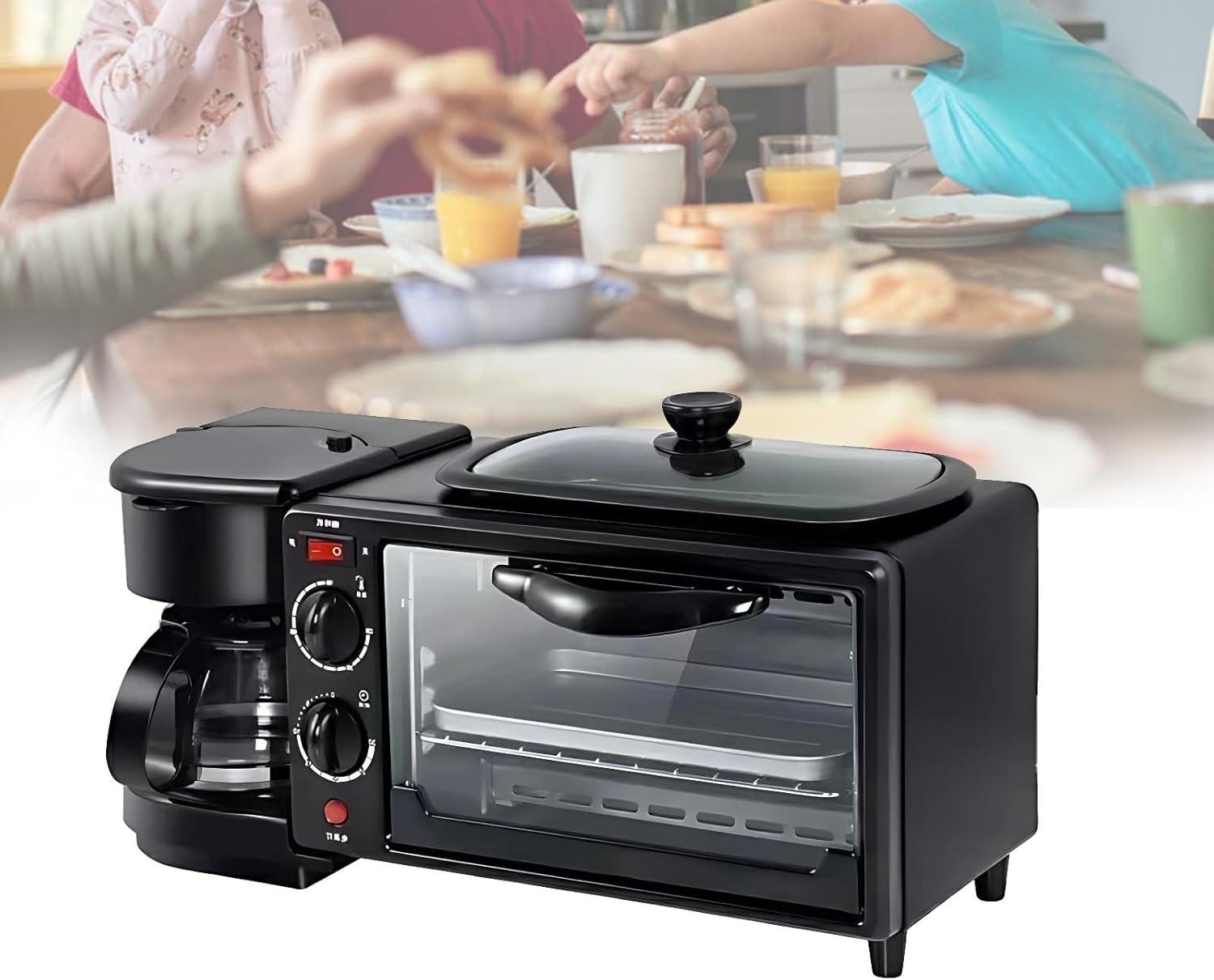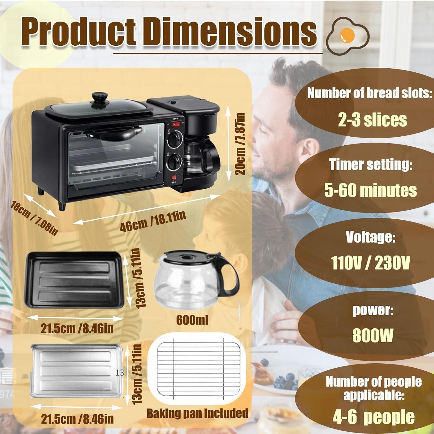 Our mornings have been fully transformed by this all-in-one breakfast station, which compactly combines a 7L mini oven, 4-cup coffee brewer, non-stick griddle with glass lid, and toaster. The autonomous controls allow us to bake, toast, brew, and grill simultaneously, making it a multitasking marvel perfect for small spaces like studios, RV kitchens, or cozy apartments. The oven’s adjustable temperature (100-230°C) and 800W dual heating elements ensure even and fast cooking, while the non-slip feet provide stability on any countertop. From crispy bacon and fluffy pancakes to fresh-brewed coffee and toasted bread, this versatile unit covers all morning essentials quickly and efficiently.