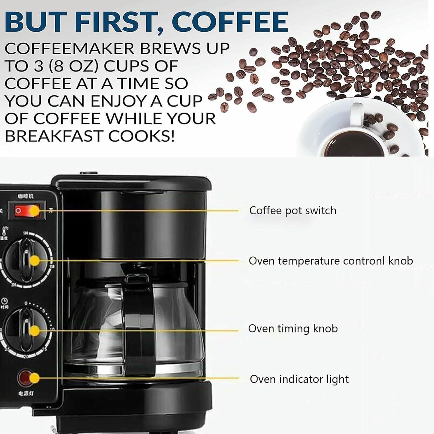 | Combines coffee maker, griddle, and toaster oven into one compact unit | Limited capacity-griddle surface and toaster oven may not suit larger families |