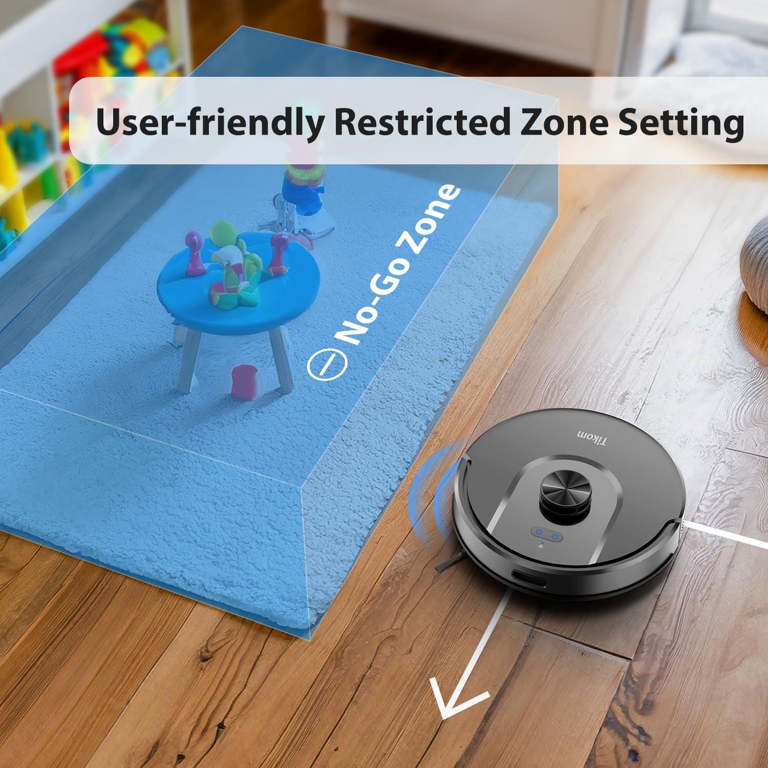 Living with the Tikom Robot Vacuum and Mop Combo, 5000Pa Suction, Smart Mapping, 45dB Robotic Vacuum Cleaner for carpets, Pet Hair, Hardfloors (L8000 Pro) over weeks quietly changes the feel of the rooms, so it reads more like background rhythm than a thing to notice. It threads around chair legs, skirts the edges of sofa bases, and slips back to its dock after the day’s passes, its low hum becoming part of the household cadence. Runners and hardwoods carry small traces of its steady rounds — faint brushing on high-traffic fabric and the occasional scuff where a threshold catches — plain signs of regular use. over time it settles into routine.