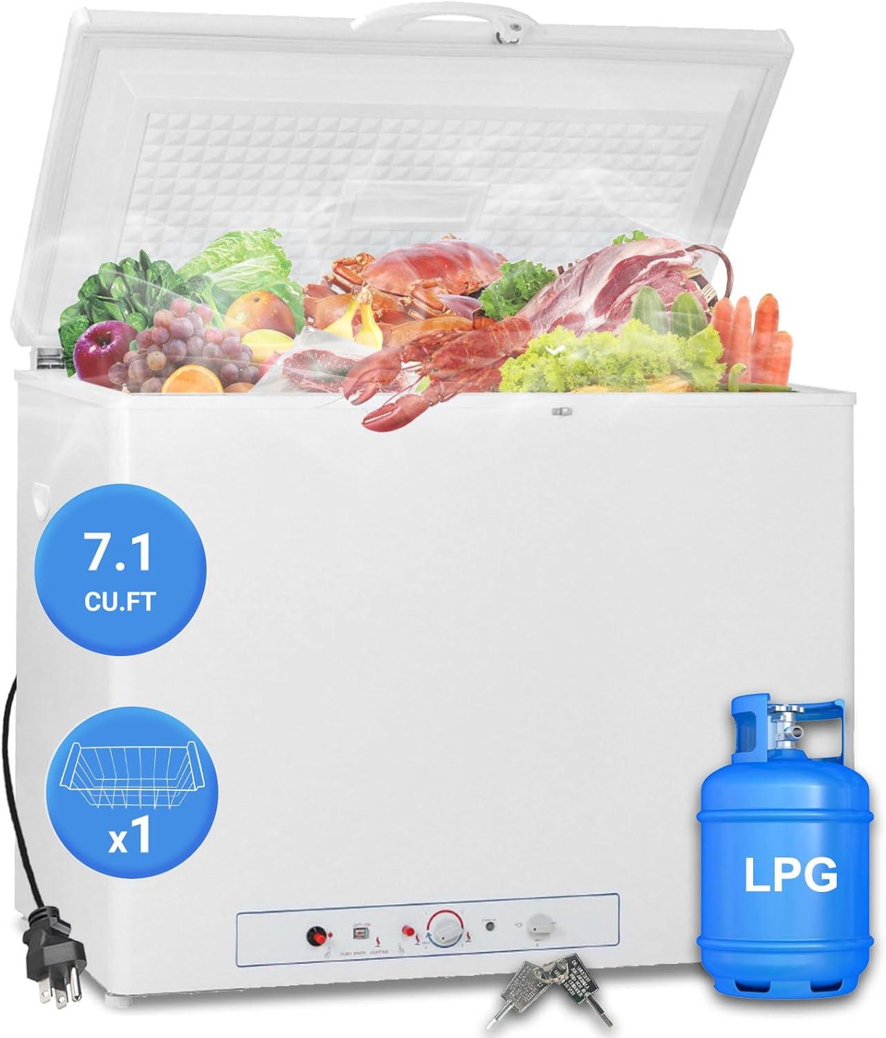 2.4 Cu.Ft. propane chest Freezer, 110V/12V/LPG Small Propane Freezer with Removable Basket and Lock, 3 Way RV Freezer for Outdoor, Camper Van, Home, Black