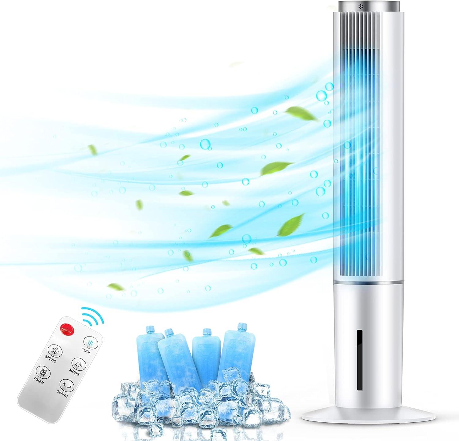 This tall evaporative cooler offers a convenient way to bring refreshing airflow into small rooms and offices without the hassle of installing a window unit. Featuring a 43-inch height, it includes four reusable ice packs to enhance cooling through evaporative technology. With a powerful 600 CFM airflow, this model oscillates up to 70° to distribute air evenly, while the 12-hour timer and three-speed settings add versatility.The included remote control allows users to adjust fan speed and mode effortlessly from a distance. Many users praise its easy assembly, sleek design, and quiet operation, making it suitable for bedrooms and workspaces looking for natural cooling without high energy consumption.