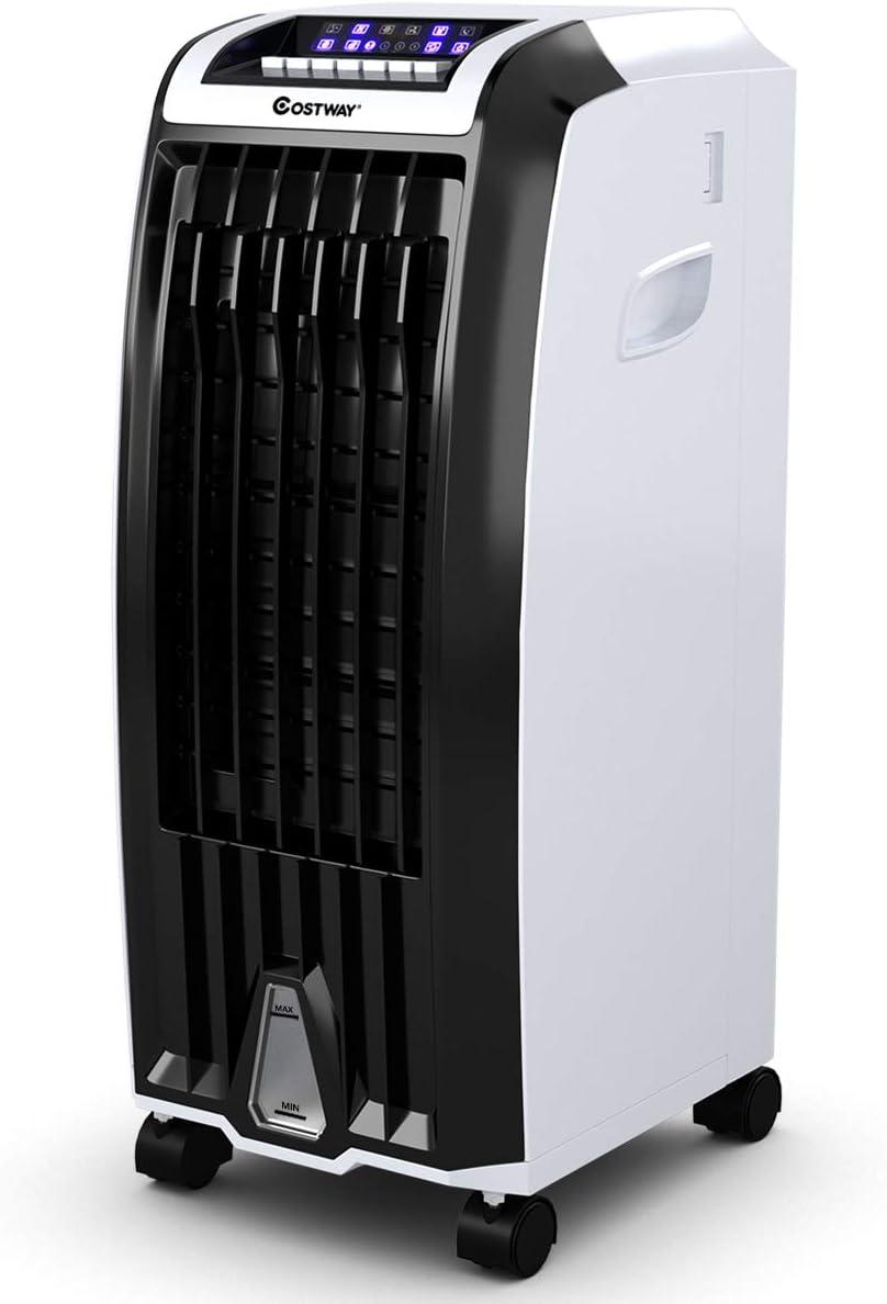 | COSTWAY Evaporative Cooler | N/A (Personal) | Fan, humidifier, cooler (3 modes) | Wheels & handles, portable | 110V / 75W | Ice crystals, 7.5h timer, remote | Home, office, dorm | ![]() |