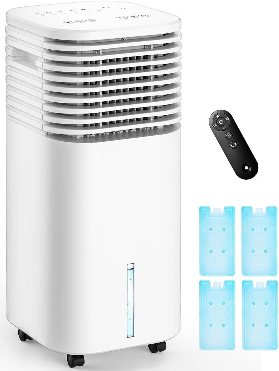 Evaporative Air Cooler Up to ‌1100 sq.ft 7 gal tank, 1-12H timer, supports continuous⁢ fill 3 speeds, natural airflow mode, remote control 4 caster wheels; sleek &‌ modern Includes ice⁢ packs; great for indoor⁣ use