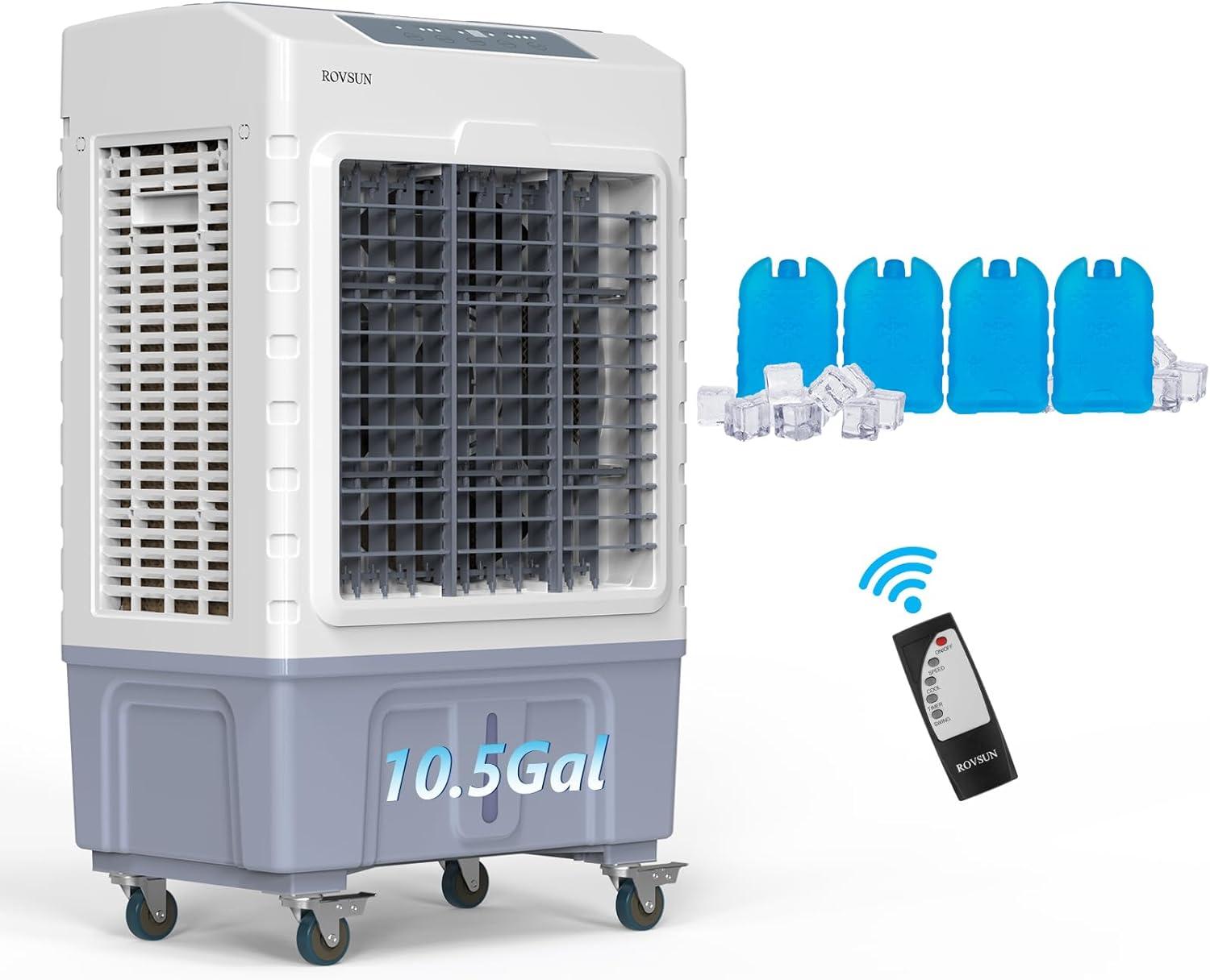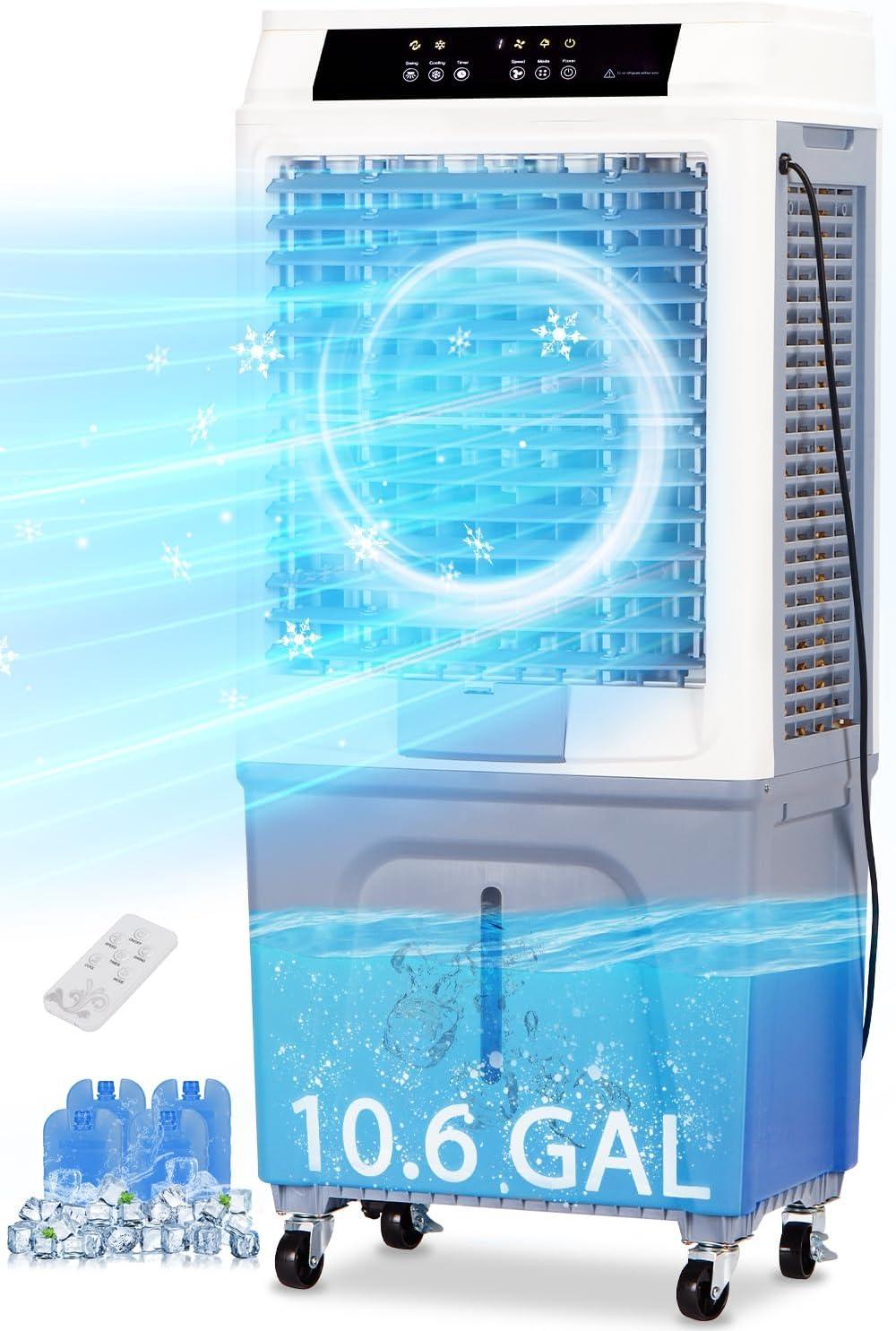 evaporative Air Cooler | Up to 2647 CFM airflow | 10.5 Gal tank, 4 ice packs | 4 wheels, lightweight | Remote & top panel controls | Moderate | Indoor/outdoor, multi-room |