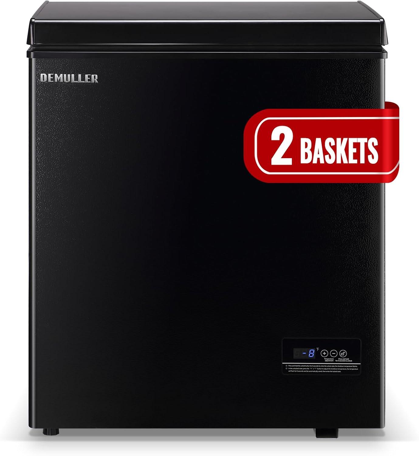 This chest freezer offers 5.1 cubic feet of storage capacity, ideal for bulk food storage or long-term freezing needs. Its sleek black finish provides a modern look that fits seamlessly into any kitchen or garage space. Featuring an adjustable thermostat, users can easily control the internal temperature to keep items perfectly frozen. the power-on indicator light adds convenience by letting you know at a glance if the freezer is operating properly. Inside, a removable vinyl-coated wire basket helps organize smaller items, making access quick and hassle-free.