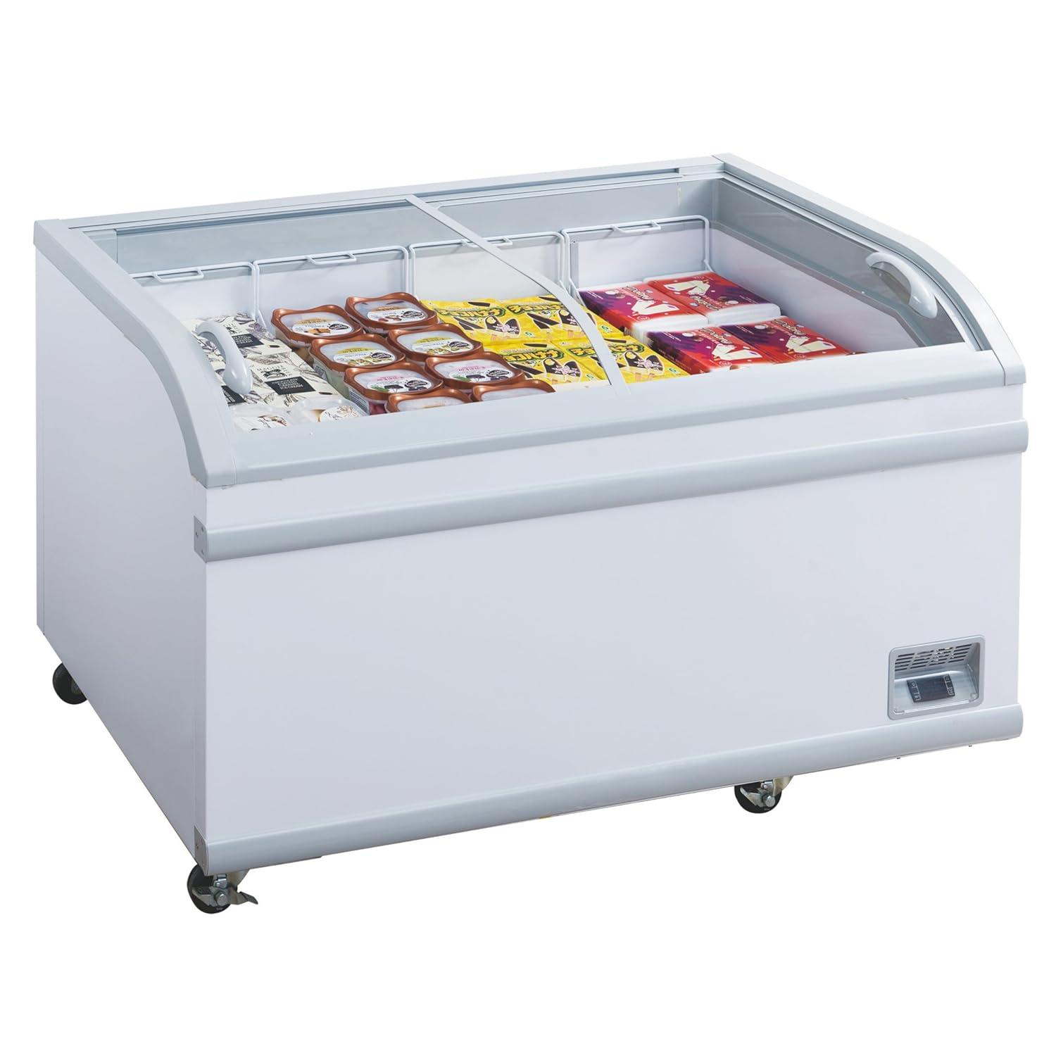 FSE 373-WD-700Y 7.0 cu. ft. Commercial Chest Freezer, 36-1/4″ x 25-5/8″ x 33-1/4″, Static Cooling, Curved UV-Filtered Glass, sliding Lids, Fan Assisted Condenser, bumper Bars