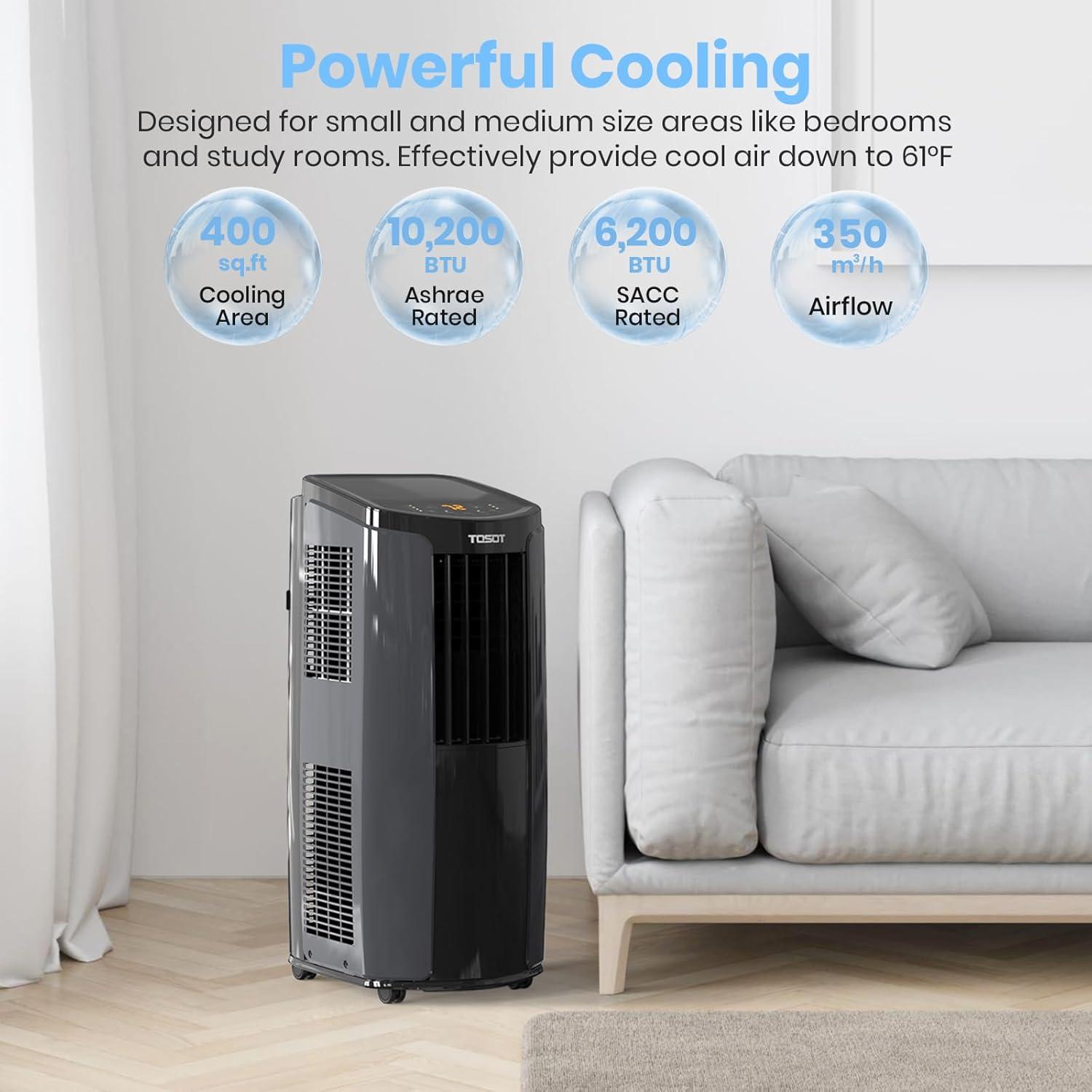 Your hand meets the cool, slightly textured plastic of the TOSOT 10,200BTU (6,200 BTU SACC) Portable Air Conditioner, Shiny Series — the compact “Shiny” portable — as you wheel it into the corner of your room; it feels a touch heavier than its tidy footprint suggests. Up close the glossy front panel catches the lamp light without shouting, the caster wheels roll with a small, reassuring resistance, and the exhaust hose snaps into place with a neat mechanical click. You press power and the unit announces itself with a steady low hum, a speedy gust from the louvers, and a faint vibration underfoot that you only notice if you stand still.Those first few minutes are all about physical presence: how it occupies the space, how the surfaces feel under your fingers, and how the initial breeze meets your skin.