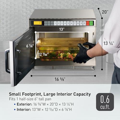 Crafted for easy maintenance, its stainless steel interior, combined with a removable ceiling plate, simplifies cleanup, an essential aspect for busy kitchens. The durable grab-and-go door is designed to withstand up to 4,000 open/close cycles, making it an ideal choice for high-use scenarios. measuring at 20 x 16.25 x 13.25 inches and weighing 68 pounds, it provides a compact solution without compromising on power and efficiency. This microwave not only holds a half-size 6” tall pan with cover but also comes with NSF and UL commercial approvals and a 1-year warranty on parts and labor.