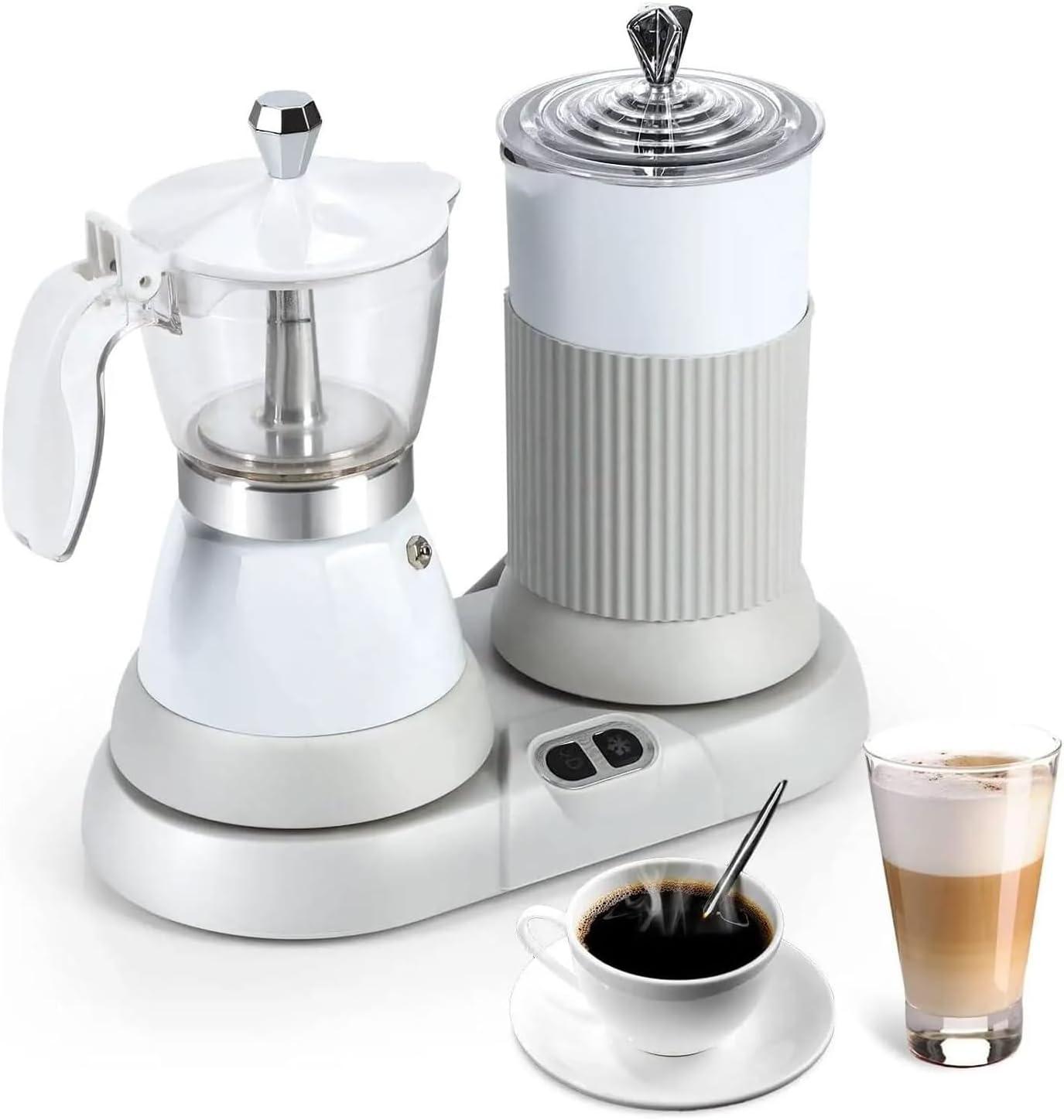 You lift the compact VitalisWorks Coffee Maker, Household Mini Automatic Milk Foaming Machine Coffee Maker, Slow Extraction Coffee Machine with Mocha Pot, Clever Temperature Control Function (white) — hereafter the VitalisWorks moka set — and feel its surprising heft settle into your palms. The aluminium body is cool and faintly textured under your fingers, the white finish smoothing out reflections without looking glossy. A soft click from the moka lid and the frother’s balanced handle register like familiar mechanical notes; when the base powers up a low,steady hum fills the small space. Visually the two-piece silhouette reads tidy and restrained, the removable carafe and frother aligning neatly so the whole thing feels like a small, purposeful presence in your morning routine.