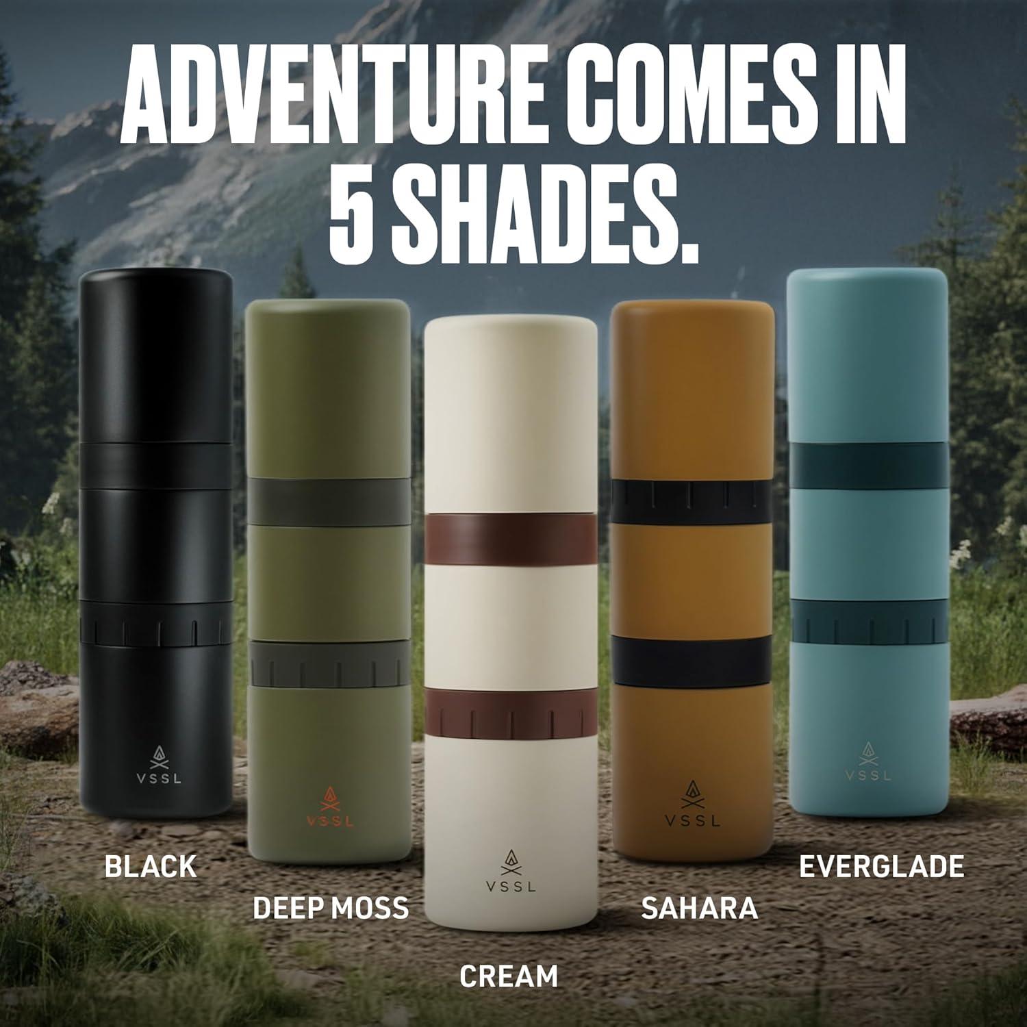 You unzip or untether the kit and the first thing you notice is how the stacked pieces come out as a single, compact object; there’s a quiet clink as metal meets metal and a reassuring heft when you lift it. As you peel away layers—cap, nested cups, the pour-over section—the surfaces feel smooth and slightly cool to the touch in the morning air, or warm if you’ve been carrying it in a pack. The motion of unpacking is rhythmic: slide, twist, lift, set down. Small details register as you work—how lids seat with a soft click, how the dripper balances when you tent it on the rim of a cup, and the way the whole assembly occupies the center of your campsite table without seeming to dominate it.