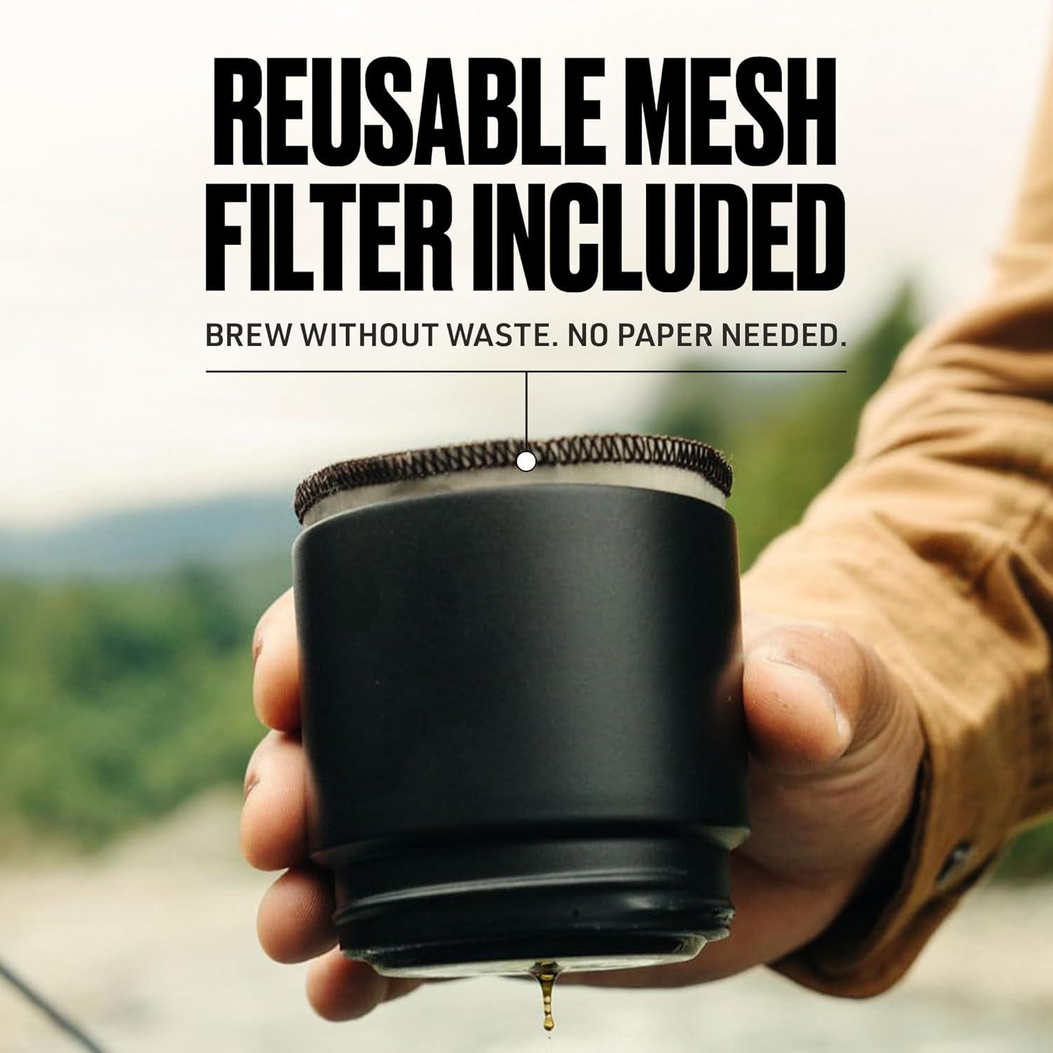 On most mornings you pull the kit from your pack, set it on a flat rock or the picnic table, and get to work without fuss. The ritual tends to be rhythmic: heat water, nest the dripper over the cup, and pour in measured bursts while you watch the bloom. The metal mesh filter collects the grounds visibly as you pour, and that visible buildup frequently enough dictates a brief pause or two — a small, habitual adjustment rather than a deliberate step. Once the last drip falls, you usually let things sit for a moment; the filter and the dripper can be hot, and the grounds compact differently depending on how you poured. In most cases a quick rinse under running water loosens the bulk of the coffee; clearing the filter while the grounds are still very hot tends to be fiddly and sometimes requires a gentle tap to dislodge the sludge.