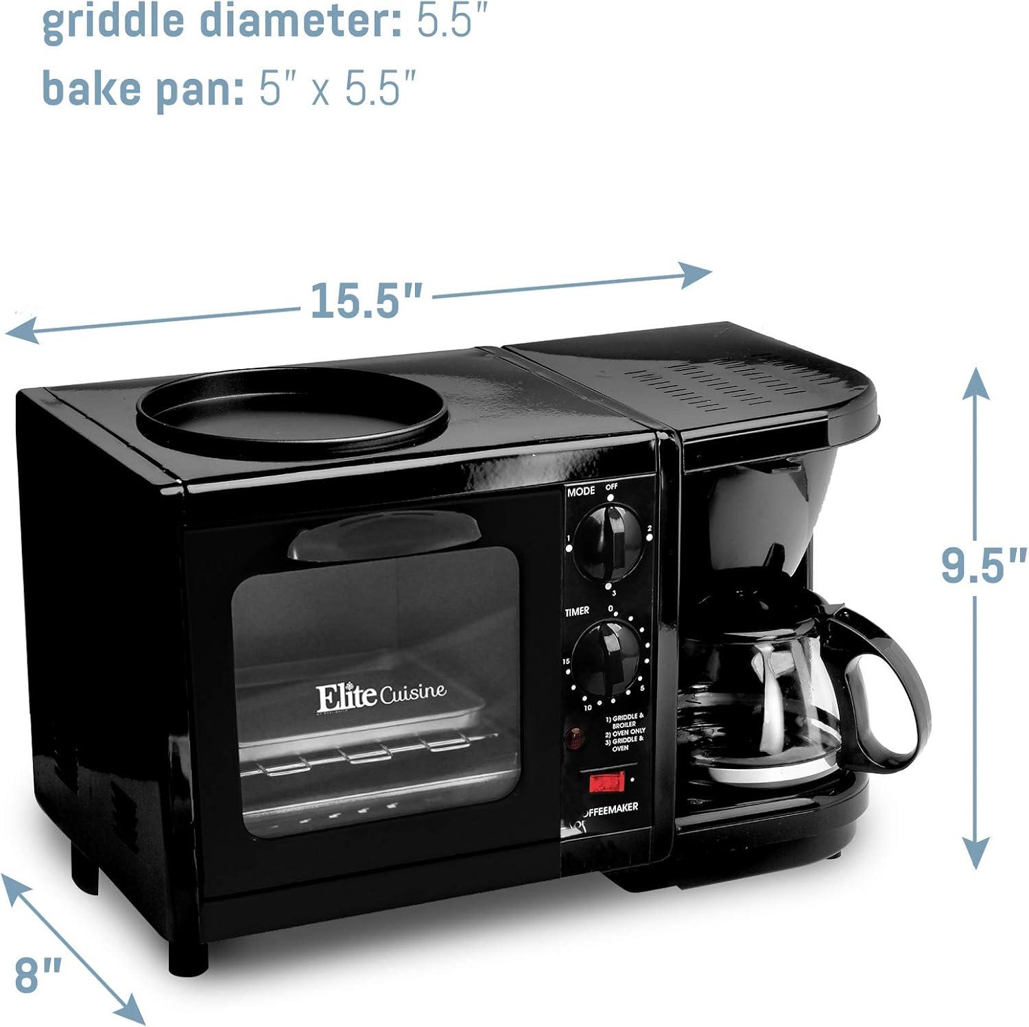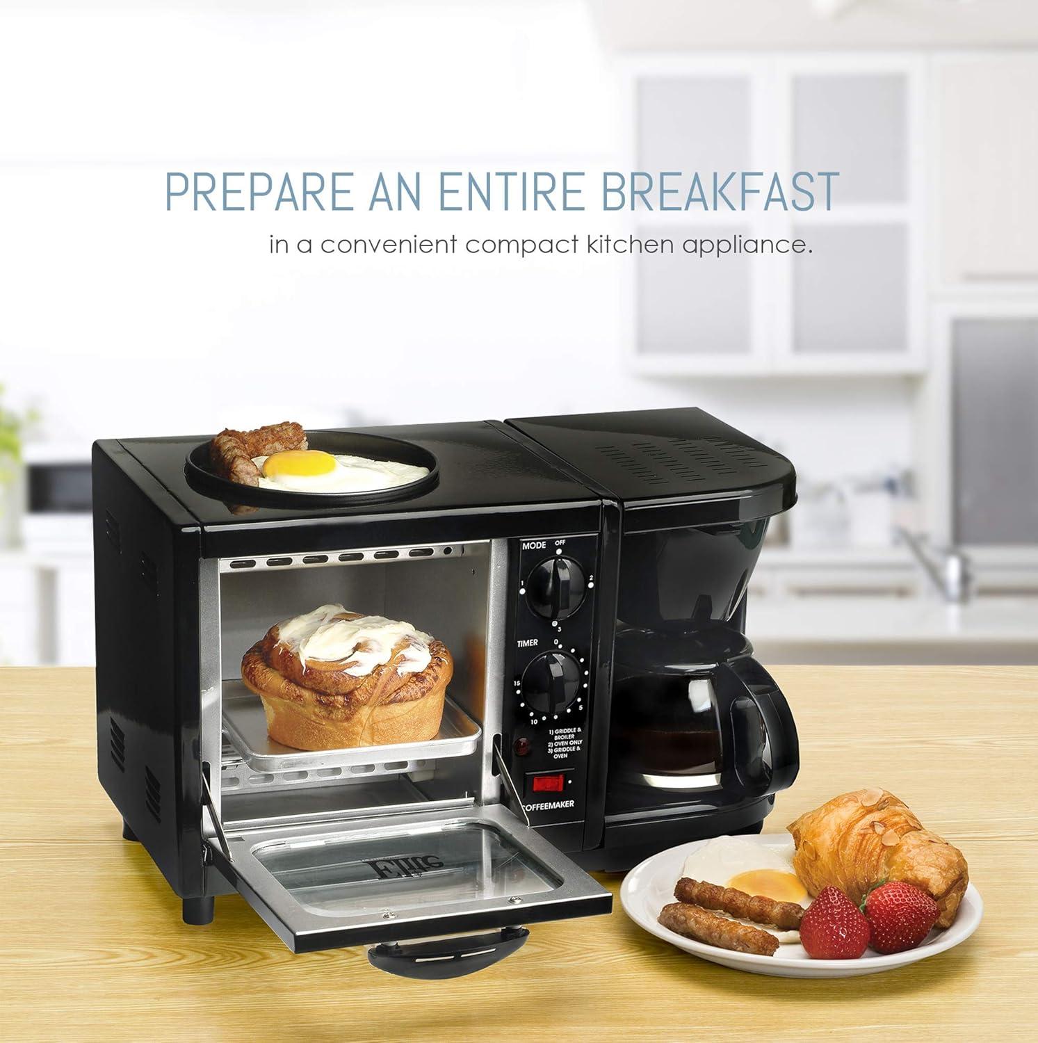 Mornings felt a little less frantic after we spent time with the Maxi-Matic EBK-200B 3-in-1 breakfast Station Toaster Oven, regular, Black. This compact unit actually pulled triple duty on our counter — a 500-watt toaster oven with a 15-minute timer, a 4-cup coffeemaker with Pause ’N Serve and a swing-out filter compartment, and a removable 6-inch griddle for eggs — so we could brew, toast and fry at once without juggling multiple appliances. We liked how the small footprint and simple ON/OFF operation made setup and cleanup straightforward, and the removable griddle saved us precious minutes at the sink. Over the next few sections we’ll share how it performed day-to-day,where it shines,and the trade-offs to expect if you’re thinking of replacing three gadgets with one.