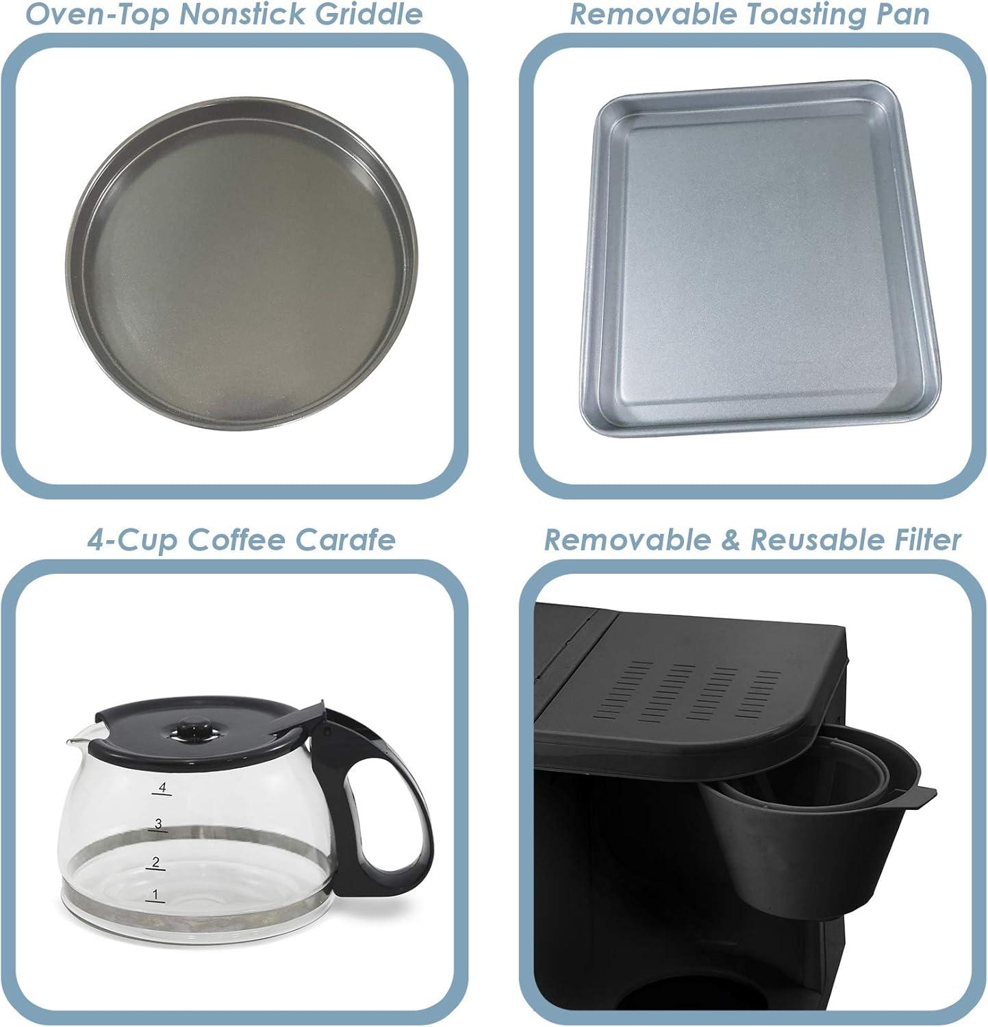 We found this compact 3-in-1 breakfast station to be an efficient way to streamline our morning routine without sacrificing functionality. The unit combines a 500-watt toaster oven with a 15-minute timer and indicator light, a 4-cup coffeemaker with Pause ’N Serve and a swing-out filter compartment, and a 6‑inch removable griddle for eggs and small skillets — all operated with a simple ON/OFF switch. It truly saves countertop space and energy while letting us brew coffee, toast bread and fry eggs simultaneously. Our quick takeaways: