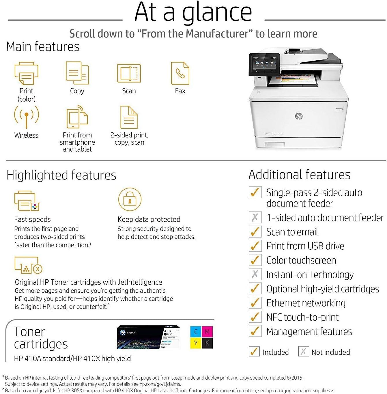 | Compact design with 4.3-inch intuitive color touchscreen | Original HP toner cartridges can be pricey over time |